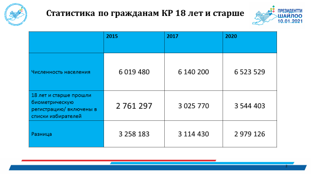 “КР Шайлоо жана референдум өткөрүү боюнча борбордук комиссиясынын 2020-жылдын 10-ноябрына карата маалыматы боюнча, республикада 3 544 403 шайлоочу бар. Алардын ичинен эркектер -1 693 035, аялдар -1 851 368 же 47,77% жана 52,23%. 2017-жылы болгон Кыргыз Республикасынын Президентин шайлоого салыштырганда шайлоочулардын санынын өсүшү – 264 473 болсо, 2015-жылы болгон КР Жогорку Кеңешине шайлоого караганда шайлоочулардын саны – 762 257ге өскөн. Шайлоочулардын санынын көбөйүшү калктын табигый көбөйүшүнө жана шайлоочулардын тизмесин жакшыртуу боюнча туруктуу жасалган иштерге байланыштуу”, - деди БШК жетекчиси.