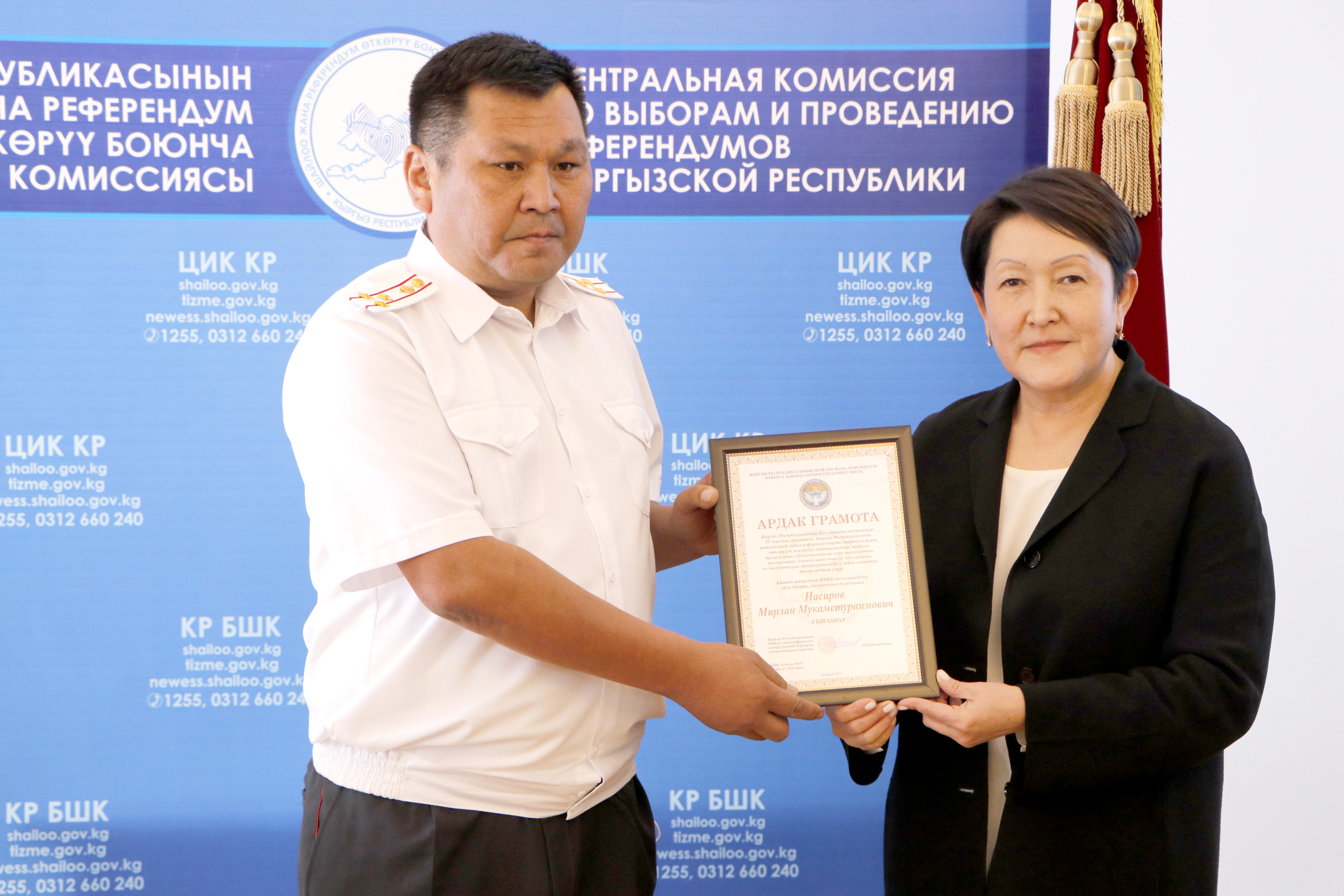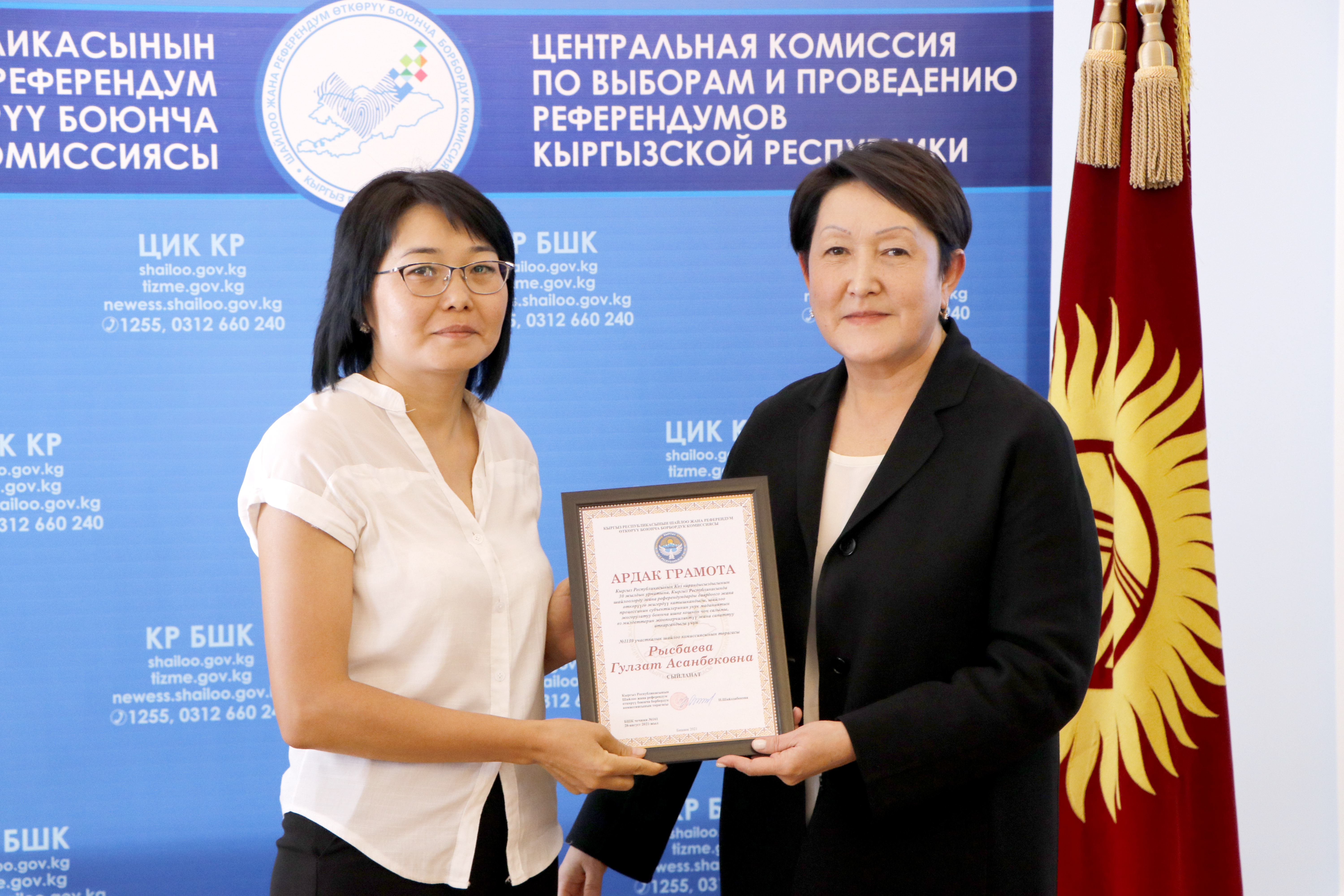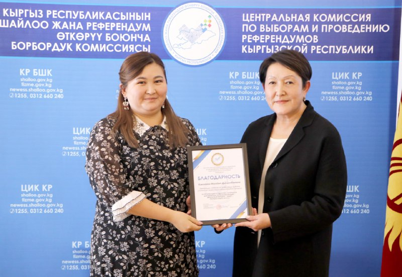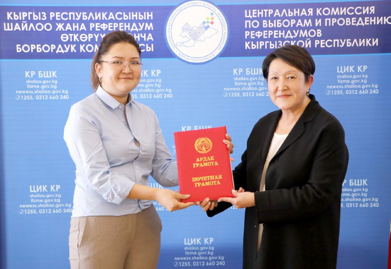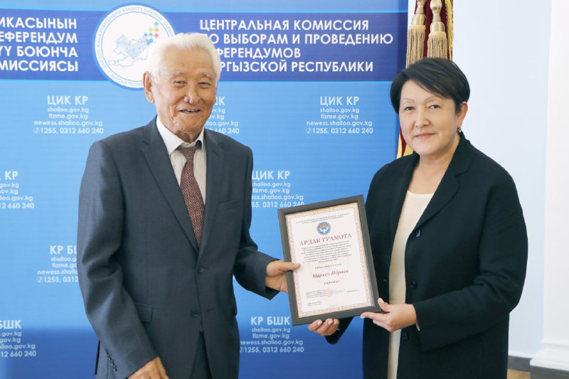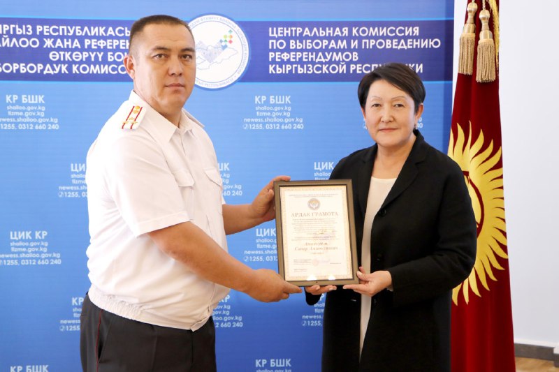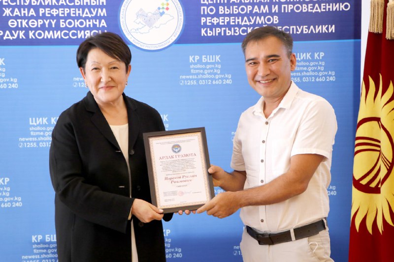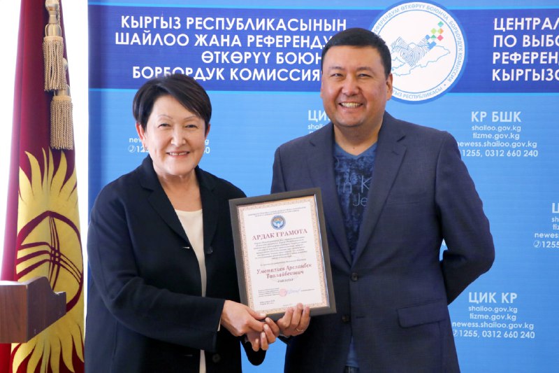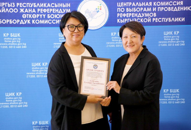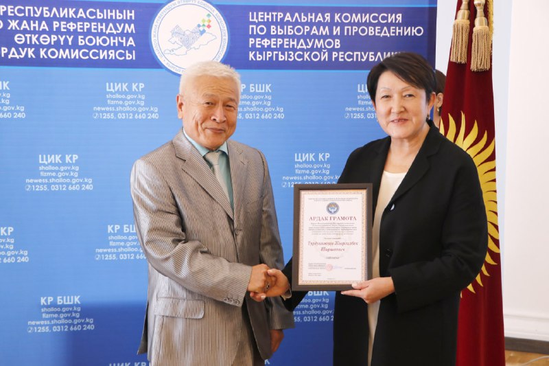 Шайлоо тутумун реформалоого, шайлоолорду өткөрүүнү даярдоого кошкон салымдары үчүн аймактык, участкалык шайлоо комиссияларынын бир катар мүчөлөрүнө, мамлекеттик органдардын, коомдук бирикмелердин, жалпыга маалымдоо каражаттарынын өкүлдөрүнө жана көз карандысыз эксперттерге Ардак грамоталар салтанаттуу кырдаалда тапшырылды.