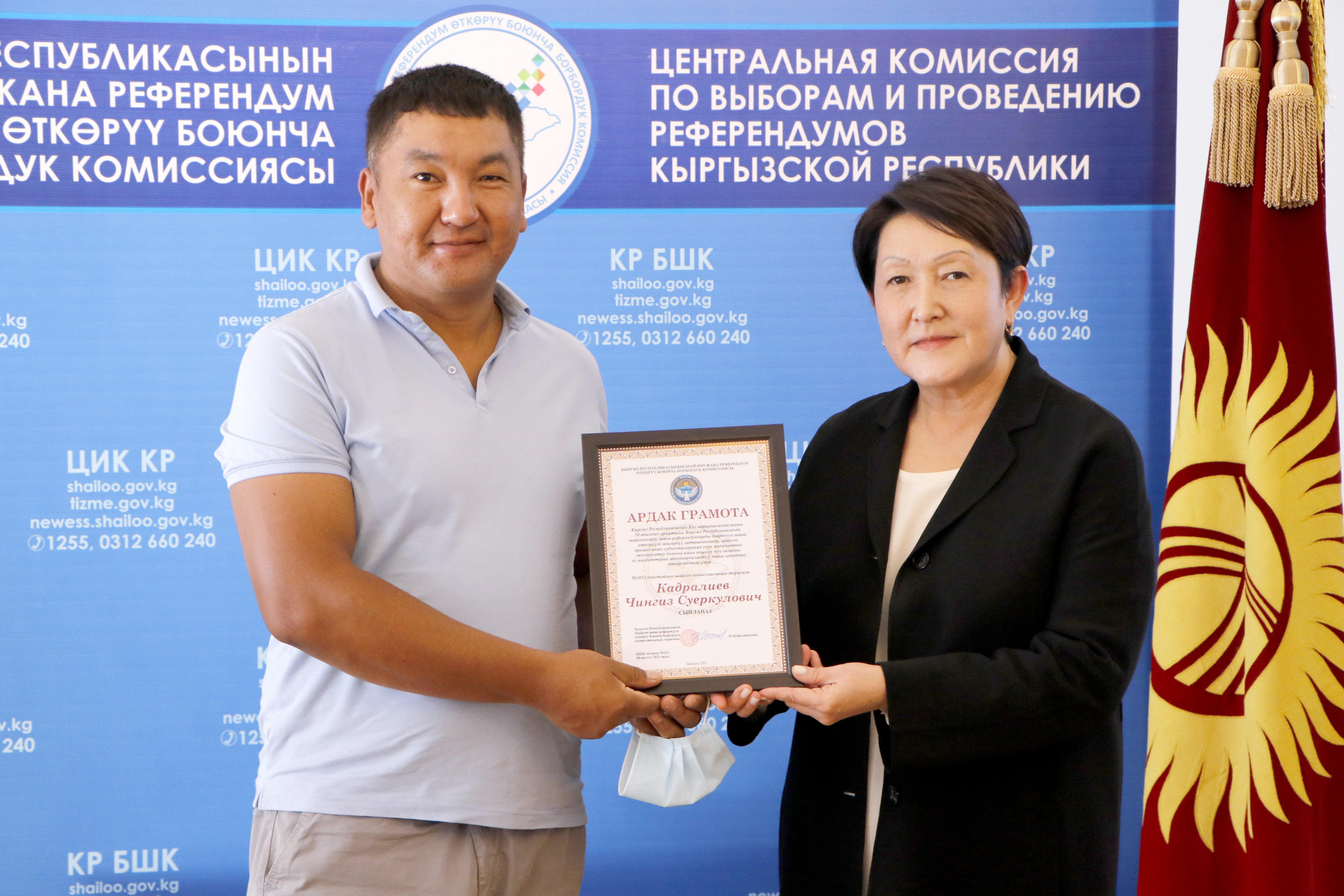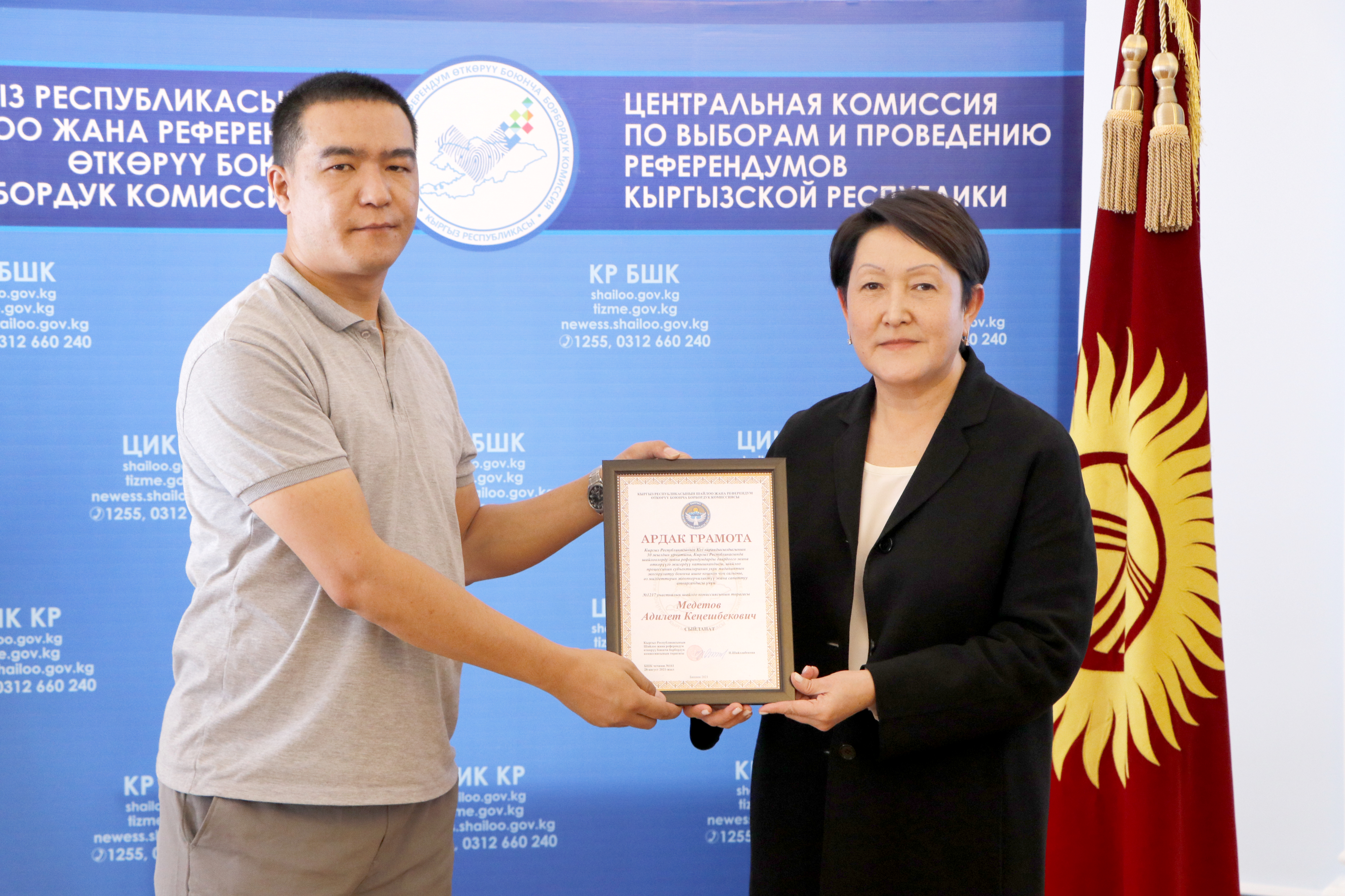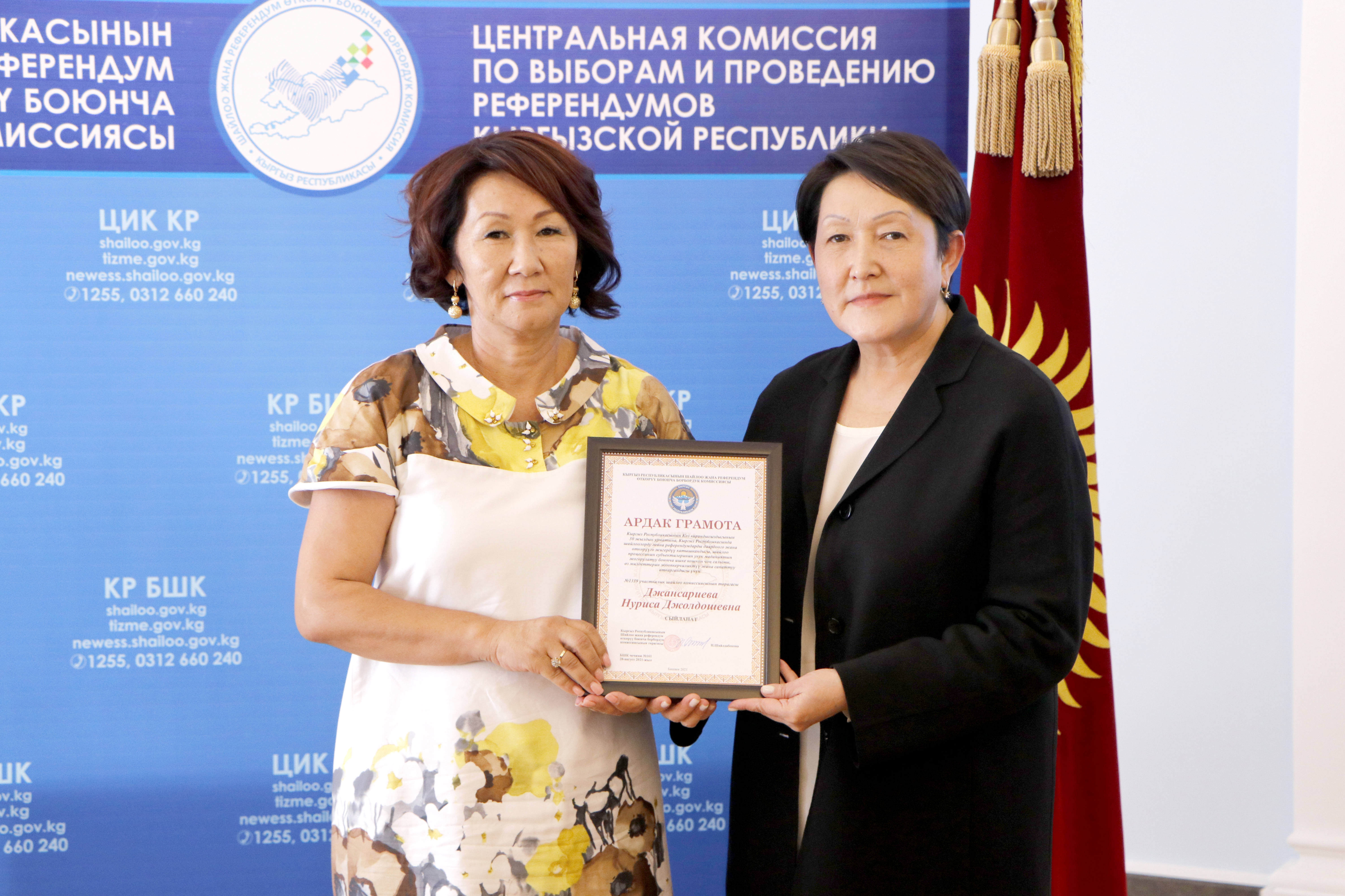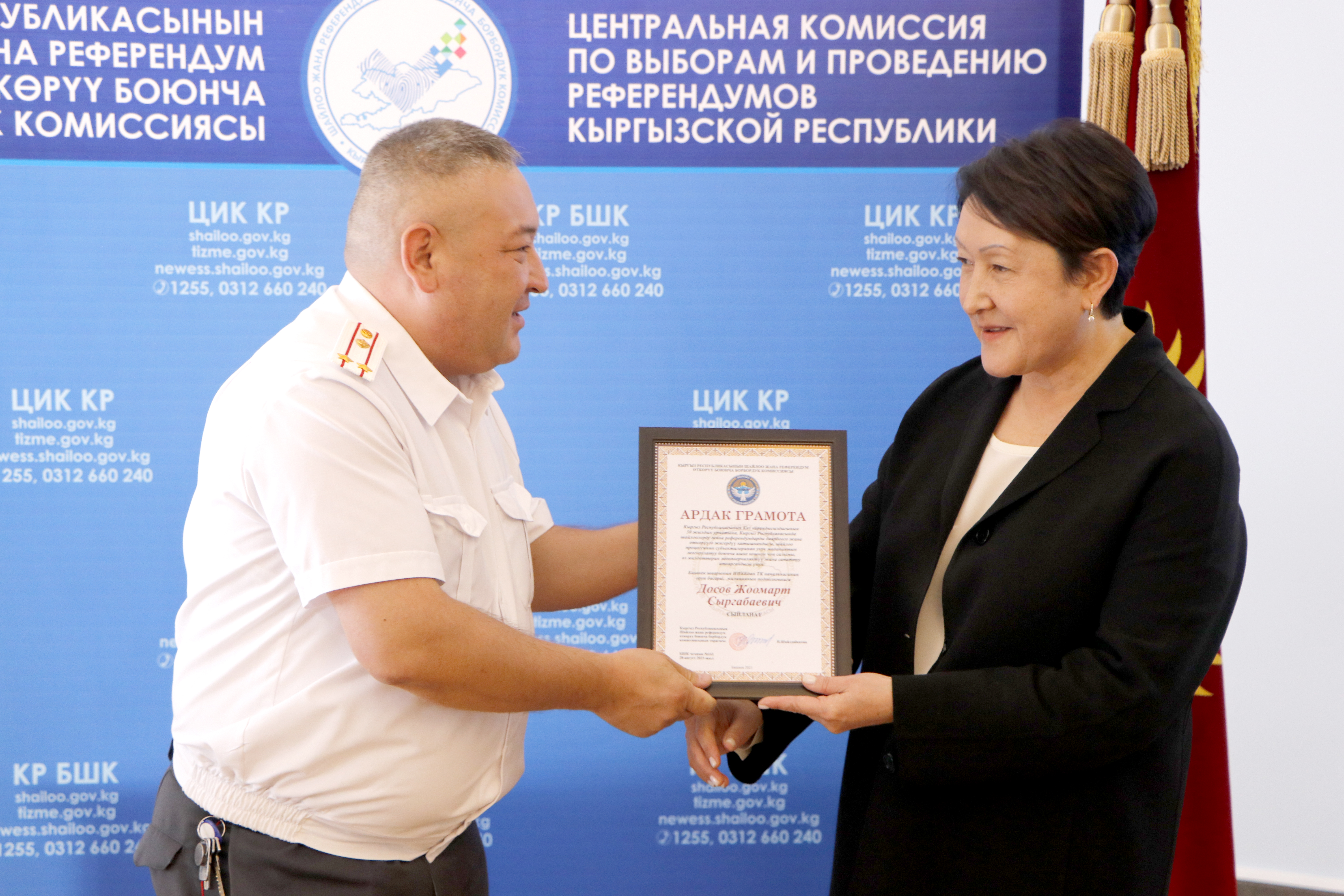 Шайлоо тутумун реформалоого, шайлоолорду өткөрүүнү даярдоого кошкон салымдары үчүн аймактык, участкалык шайлоо комиссияларынын бир катар мүчөлөрүнө, мамлекеттик органдардын, коомдук бирикмелердин, жалпыга маалымдоо каражаттарынын өкүлдөрүнө жана көз карандысыз эксперттерге Ардак грамоталар салтанаттуу кырдаалда тапшырылды.