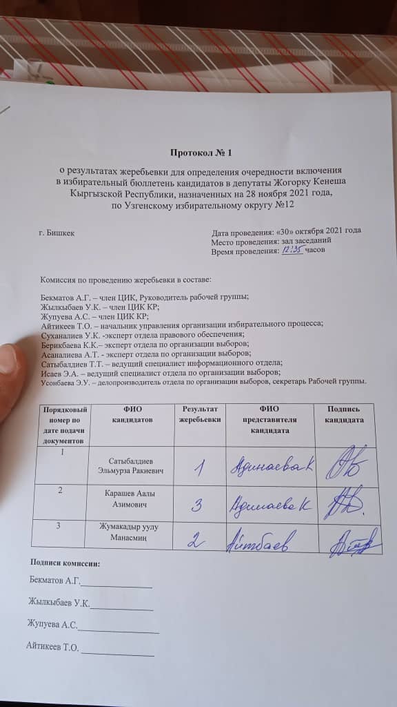 Кыргыз Республикасынын Шайлоо жана референдум өткөрүү боюнча борбордук комиссиясы 2021-жылдын 28-ноябрына дайындалган Кыргыз Республикасынын Жогорку Кеңешинин депутаттарын шайлоодо №12 Өзгөн шайлоо округу боюнча шайлоо бюллетенинде талапкерлердин орундарын аныктоо боюнча чүчүкулак өткөрдү.