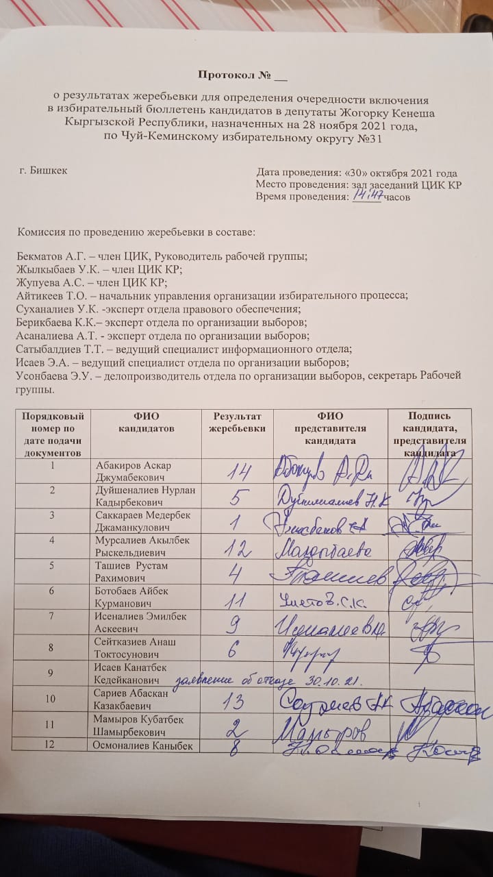 Кыргыз Республикасынын Шайлоо жана референдум өткөрүү боюнча борбордук комиссиясы 2021-жылдын 28-ноябрына дайындалган Кыргыз Республикасынын Жогорку Кеңешинин депутаттарын шайлоодо №31 Чүй-Кемин шайлоо округу боюнча шайлоо бюллетенинде талапкерлердин орундарын аныктоо боюнча чүчүкулак өткөрдү.