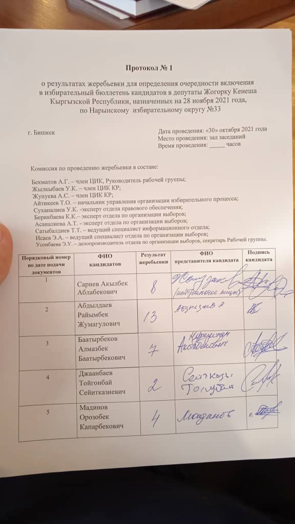 Кыргыз Республикасынын Шайлоо жана референдум өткөрүү боюнча борбордук комиссиясы 2021-жылдын 28-ноябрына дайындалган Кыргыз Республикасынын Жогорку Кеңешинин депутаттарын шайлоодо №33 Нарын шайлоо округу боюнча шайлоо бюллетенинде талапкерлердин орундарын аныктоо боюнча чүчүкулак өткөрдү.