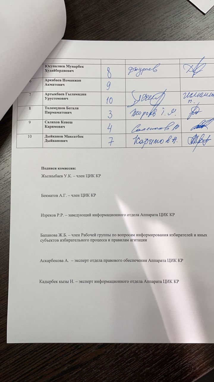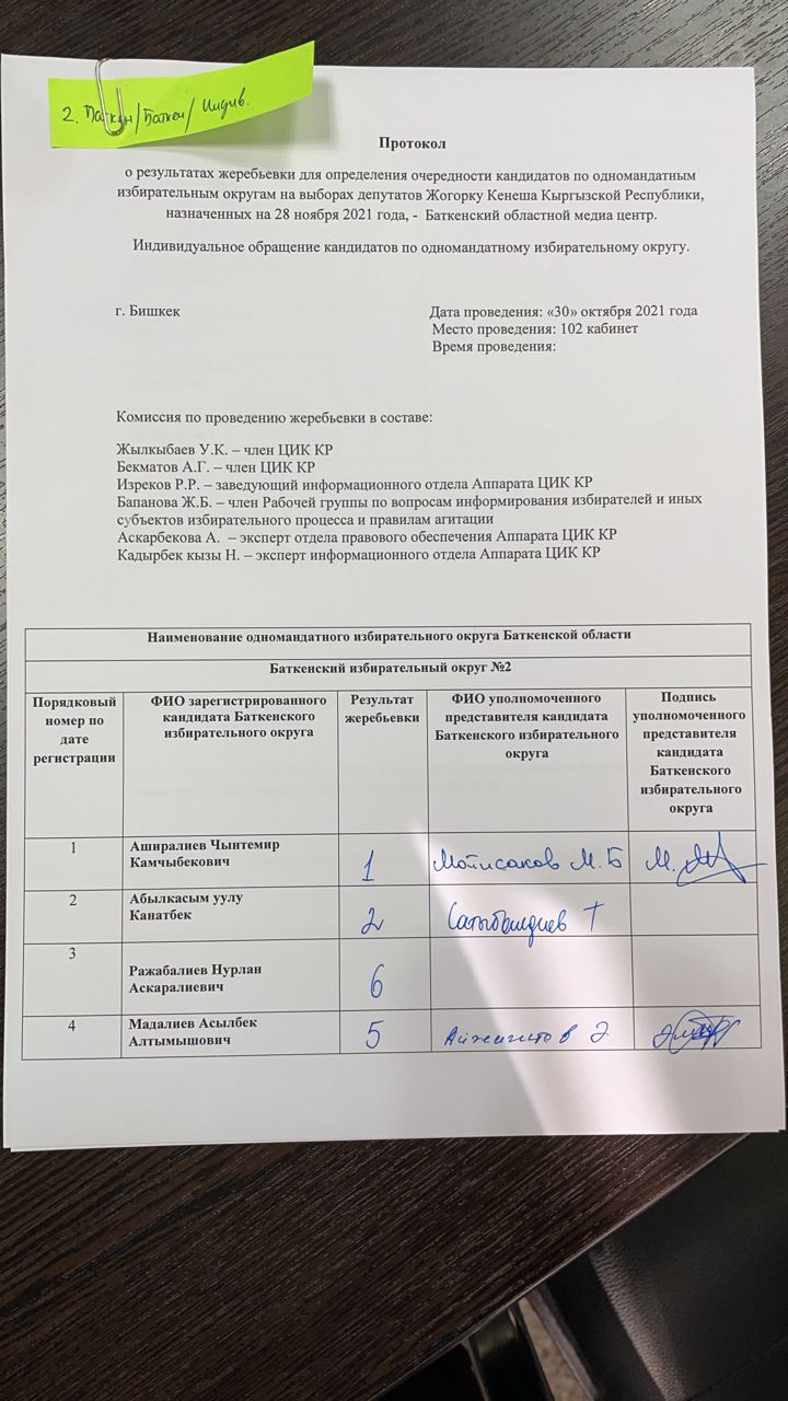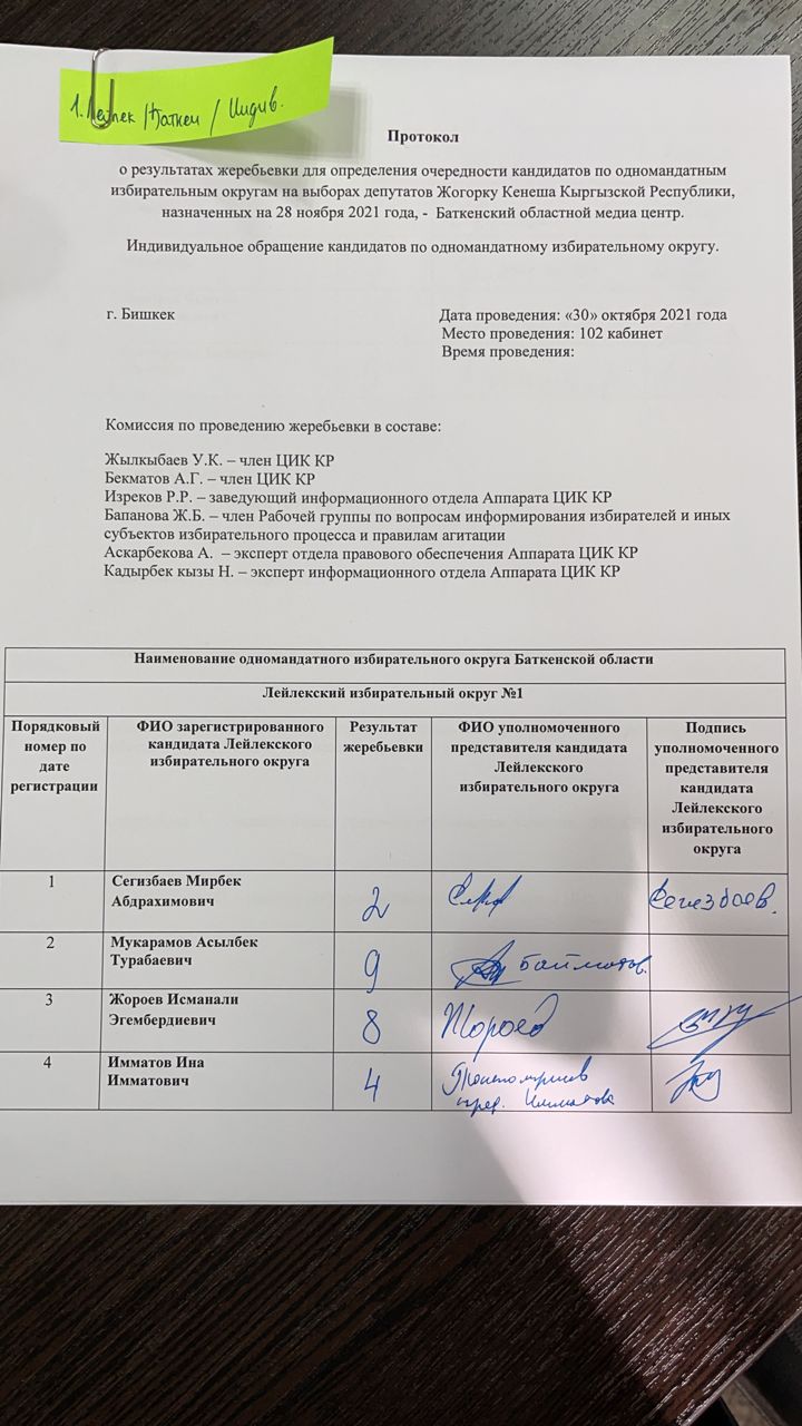 Кыргыз Республикасынын Шайлоо жана референдум өткөрүү боюнча борбордук комиссиясы Баткен облусунун №1 Лейлек, №2 Баткен, №3 Кадамжай бир мандаттуу шайлоо округдары боюнча Кыргыз Республикасынын Жогорку Кеңешинин депутаттарын шайлоого катышуу үчүн катталган талапкерлерге Баткен медиа борборунда акысыз обо убактысын бөлүштүрүү боюнча чүчүкулак өткөрдү.