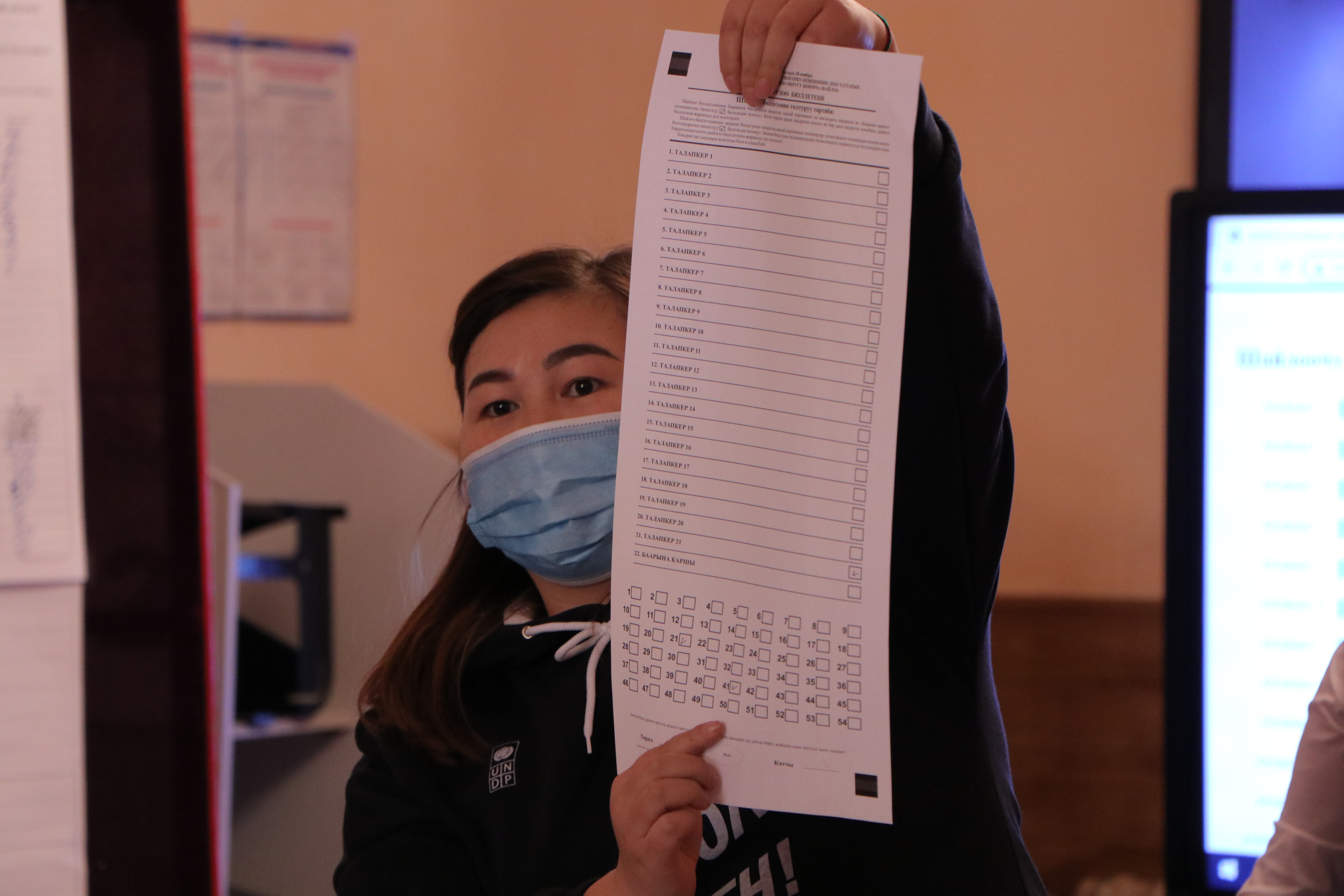 Добуш берүүгө катышкан шайлоочуларга 2ден шайлоо бюллетени берилди. Бир мандаттуу округ боюнча шайлоодо шайлоочу шайлоо бюллетенинде: