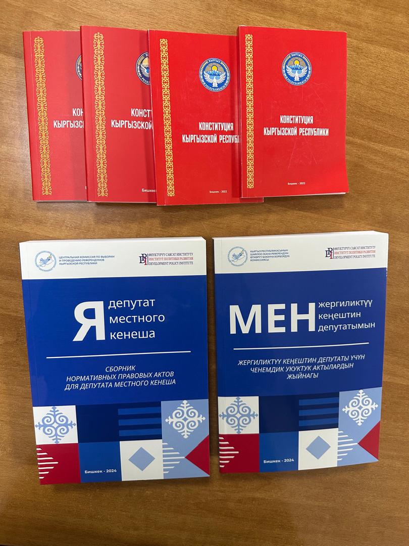 Жергиликтүү кеңештердин депутаттарынын өзгөчө ролун жана алардын ишмердүүлүгүн мыйзамдардын негизинде жүзѳгѳ ашыруунун маанилүүлүгүн түшүнүү менен Борбордук шайлоо комиссиясы «Өнүктүрүү саясат институту» коомдук бирикмеси менен биргеликте жергиликтүү кеңештин ар бир депутатын жергиликтүү өз алдынча башкаруу чөйрөсүндөгү негизги ченемдик укуктук актылар камтылган (республика боюнча бардыгы болуп 6384 депутат шайланган) ченемдик-укуктук актылардын жыйнагы менен камсыз кылат. Ошондой эле, Кыргыз Республикасынын Конституциясынын тексти бүткүл республика боюнча кеңештерге берилет.