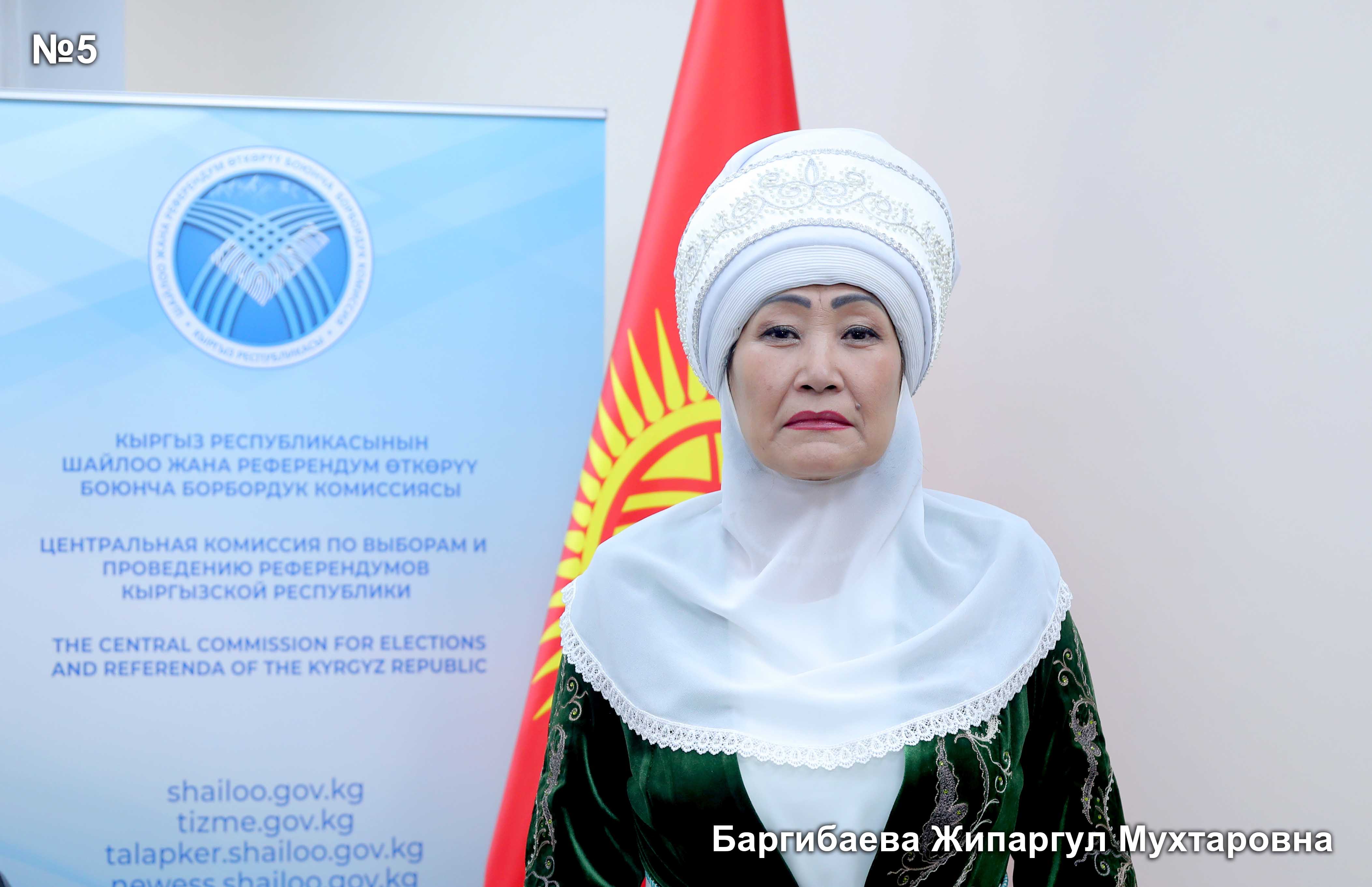 - Баргибаева Жипаргул Мухтаровна 18.05.1970 «Ала-Тоо айымдары» коомдук кайрымдуулук фондунун төрайымы