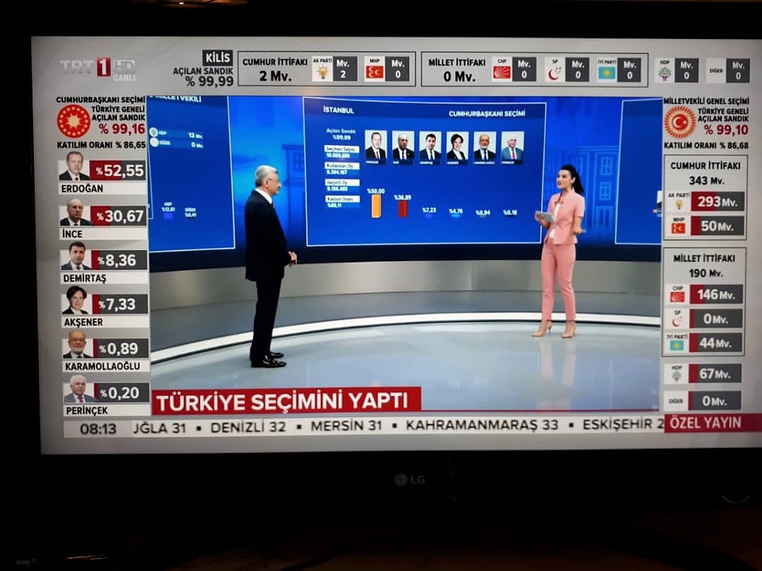 По итогам голосования на президентских выборах, где подсчитано 99,16% голосов, предварительно побеждает действующий президент Реджеп Эрдоган – 52,55%. У его ближайшего соперника Мухаррема Индже 30,67%.