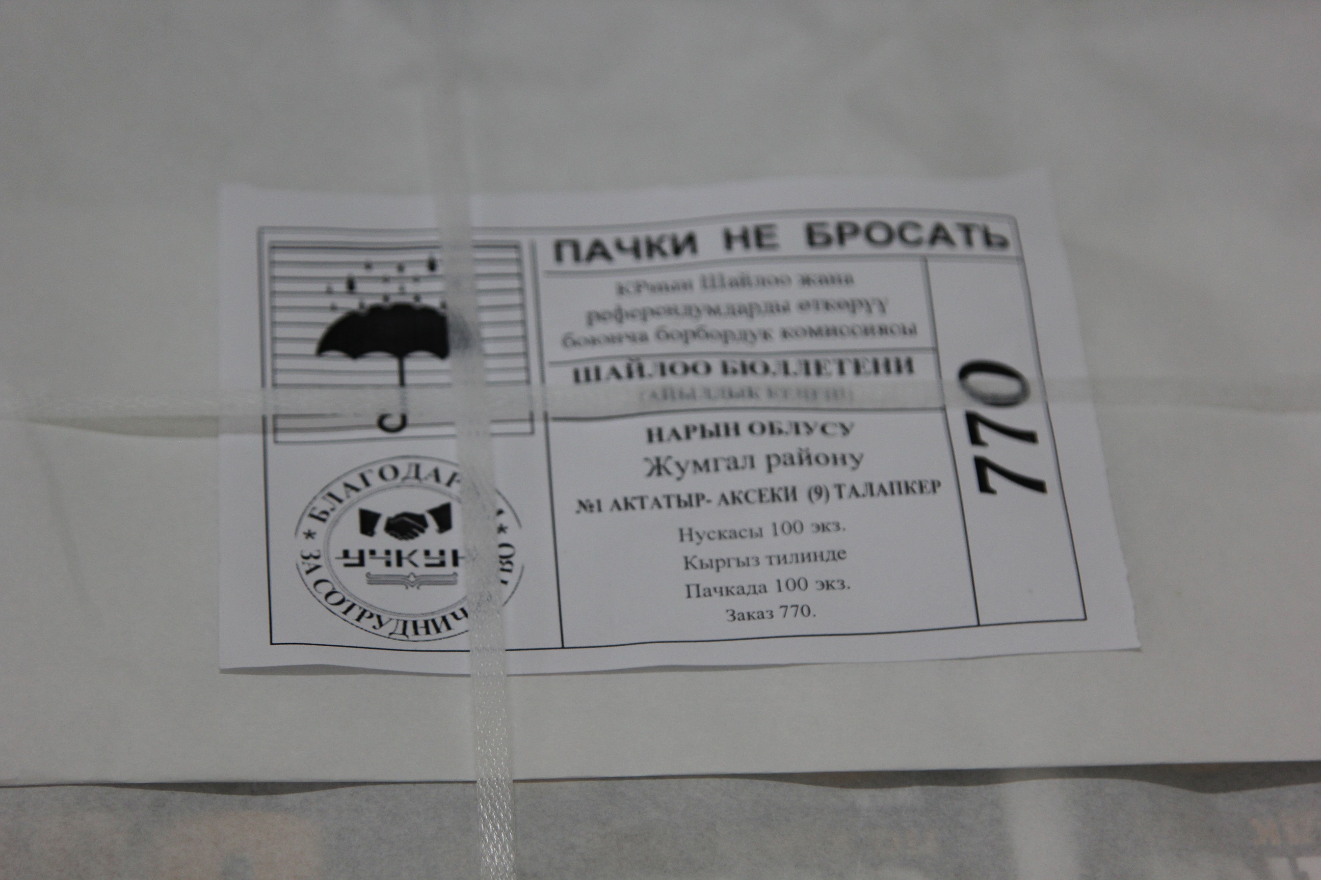 Сотрудниками аппарата осуществлялось (круглосуточное) наблюдение процесса изготовления бюллетеней в ОАО «Учкун». Охрана была обеспечена сотрудниками правоохранительных органов (ГКНБ и МВД).