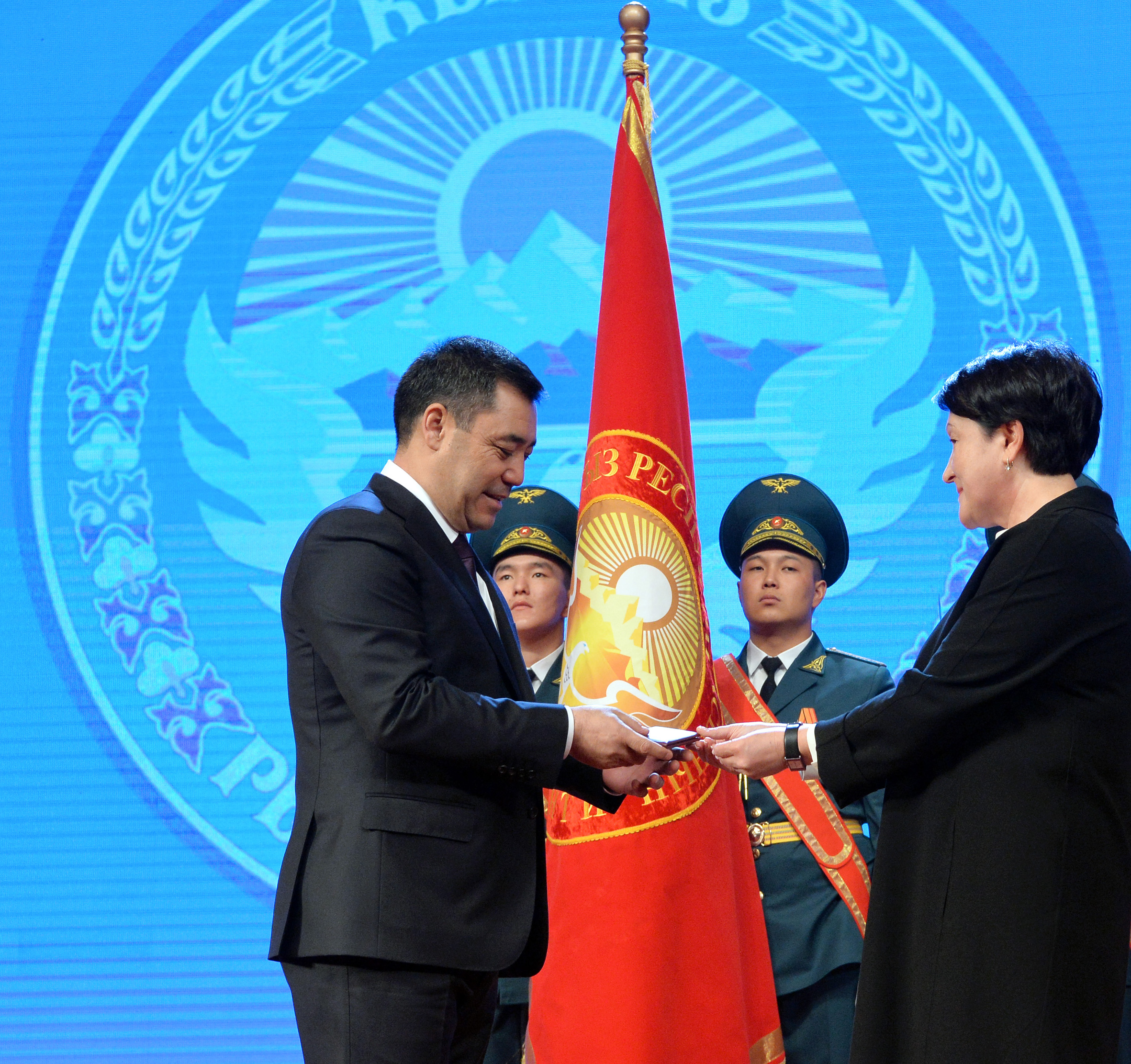 Председатель ЦИК КР Н.Шайлдабекова вручила Жапарову С.Н. удостоверение об избрании Президентом, знаки отличия - нагрудный знак и Штандарт (флаг) Президента с выгравированными его фамилией, именем и отчеством и датами срока полномочий.