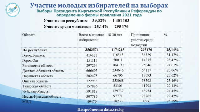 “Это особенность выборов в Кыргызстане – очень большая доля молодежи в списке избирателей. На прошедших досрочных выборах Президента Кыргызской Республики 10 января текущего года при общей явке 39,32%, участие молодежи от 18 до 30 лет включительно составило 25,14%.