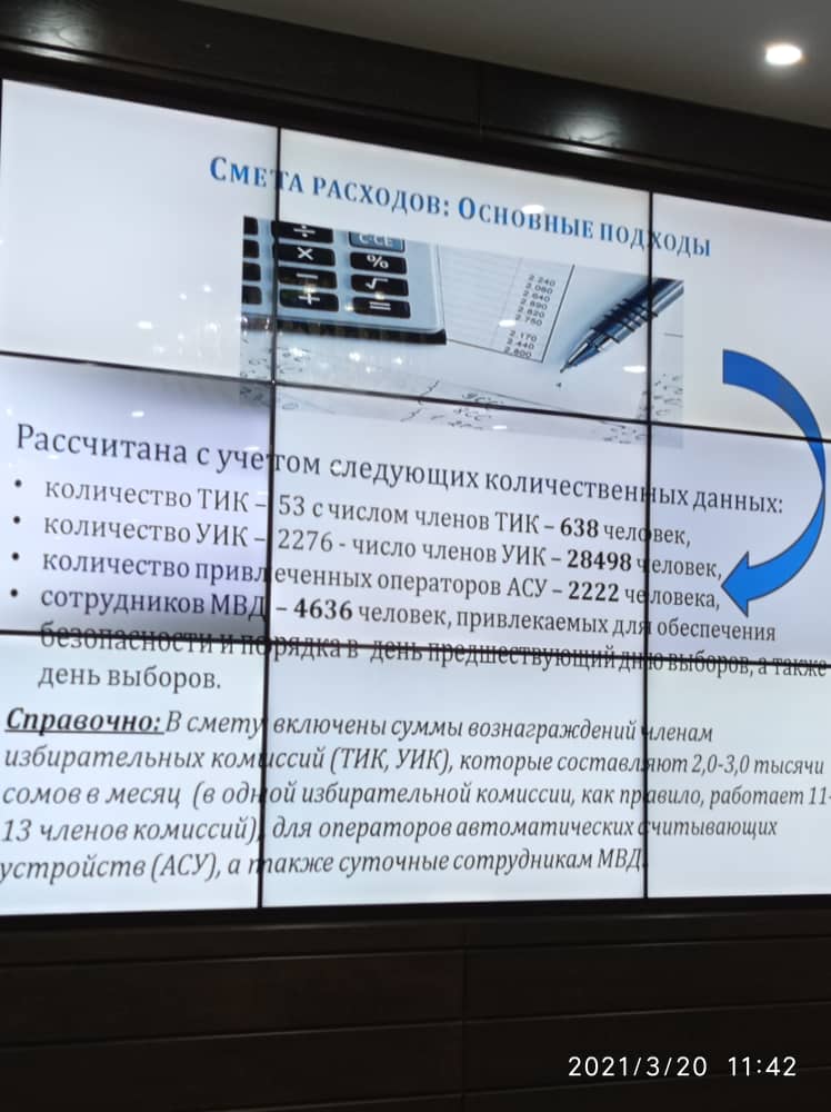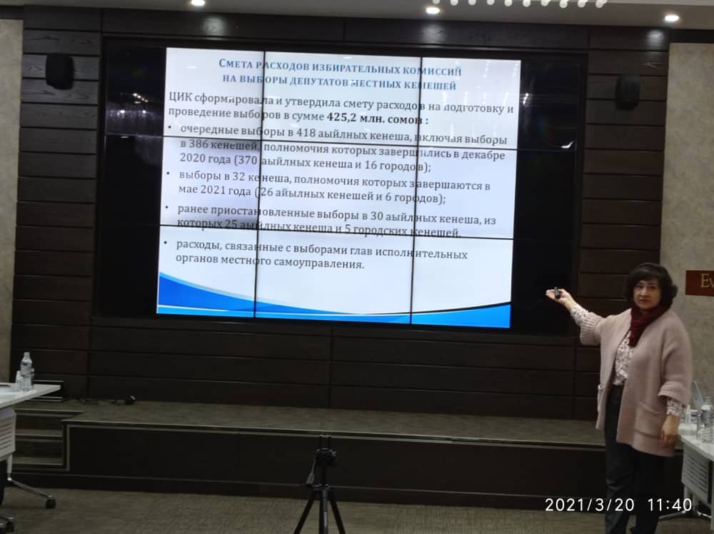 Представителей средств массовой информации и гражданского общества информировали об особенностях формирования сметы расходов на выборы в местные кенеши. Смета содержит расходы на приобретение товаров и услуг, необходимых для подготовки и проведения выборов - расходы на служебные поездки и обучающие мероприятия членов избирательных комиссий и операторов оборудования, услуги связи, транспортные расходы по доставке оборудования и материалов, по перевозке внутри регионов оборудование по биометрической идентификации избирателей, комплекты компьютерной техники, автоматические считывающие устройства для приема и обработки бюллетеней, бюллетени, информационные материалы, в том числе баннеры, канцелярские принадлежности.