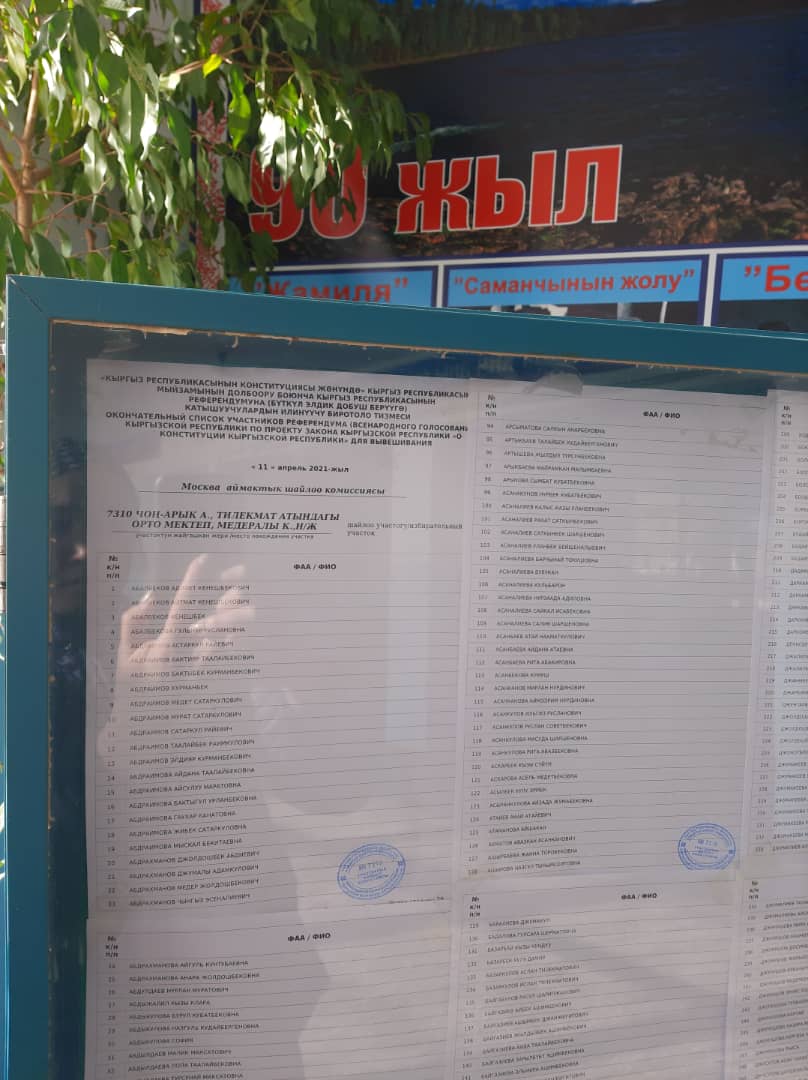 Всего в списки избирателей по выборам депутатов местных кенешей включены 3 318 130 избирателей, а в список участников референдума - 3 606 201. Поскольку выборы депутатов местных кенешей проводятся не во всех городах и аймаках, а также не проводятся за рубежом, список избирателей и список участников референдума отличаются.