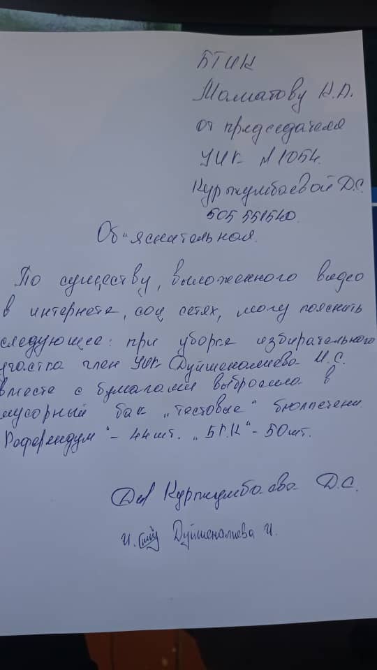 По видео, опубликованном на интернет-портале КЛООП.KG - Бишкекская ТИК заявляет, что данные бюллетени являются тестовыми и использовались участковой избирательной комиссией при тестировании оборудования (Объяснительная председателя УИК №1054 прилагается). По итогам расследования будут приняты меры к ответственным лицам.