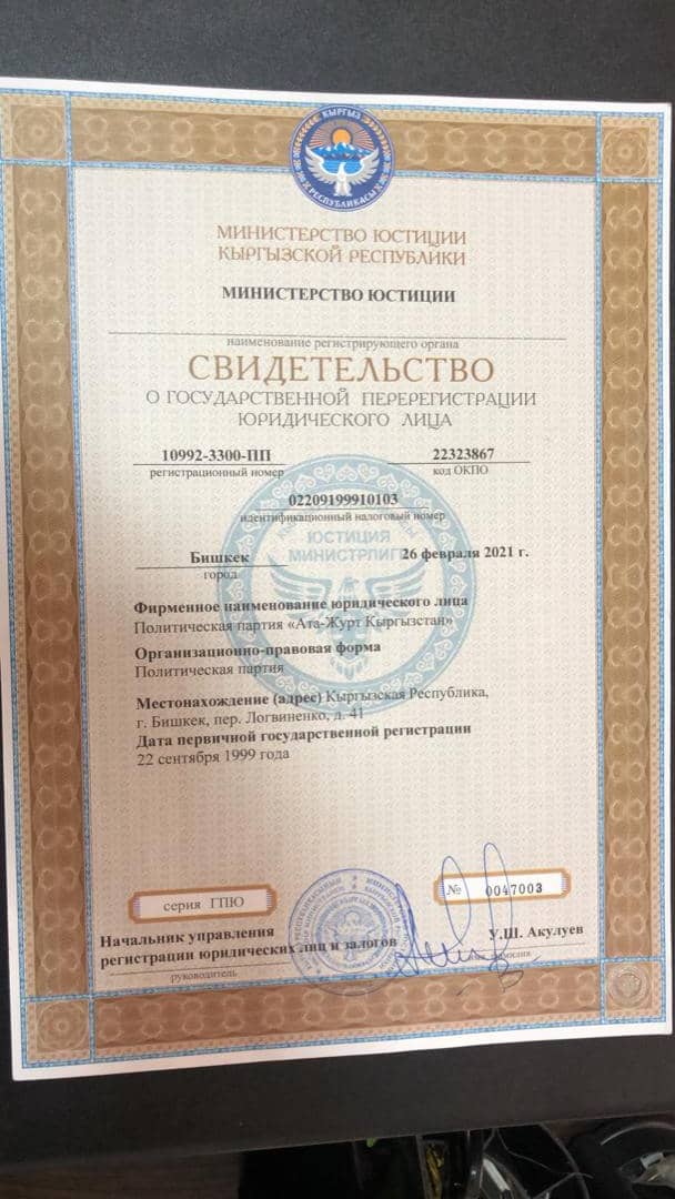 Согласно представленному свидетельству политическая партия «Ата-Журт Кыргызстан» прошла государственную перерегистрацию 26 февраля 2021 года, датой первичной государственной регистрации данной политической партии указано 22 сентября 1999 года.