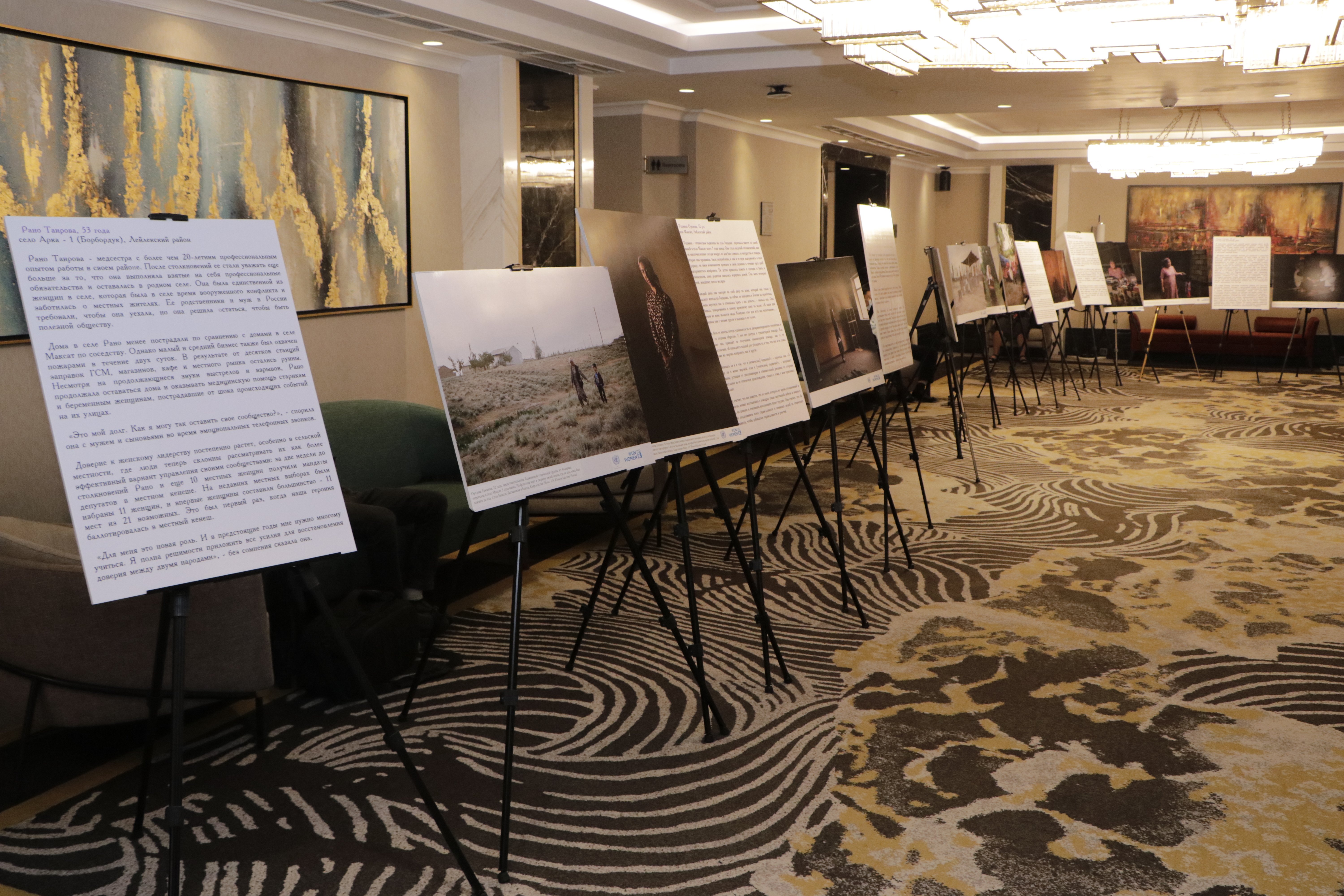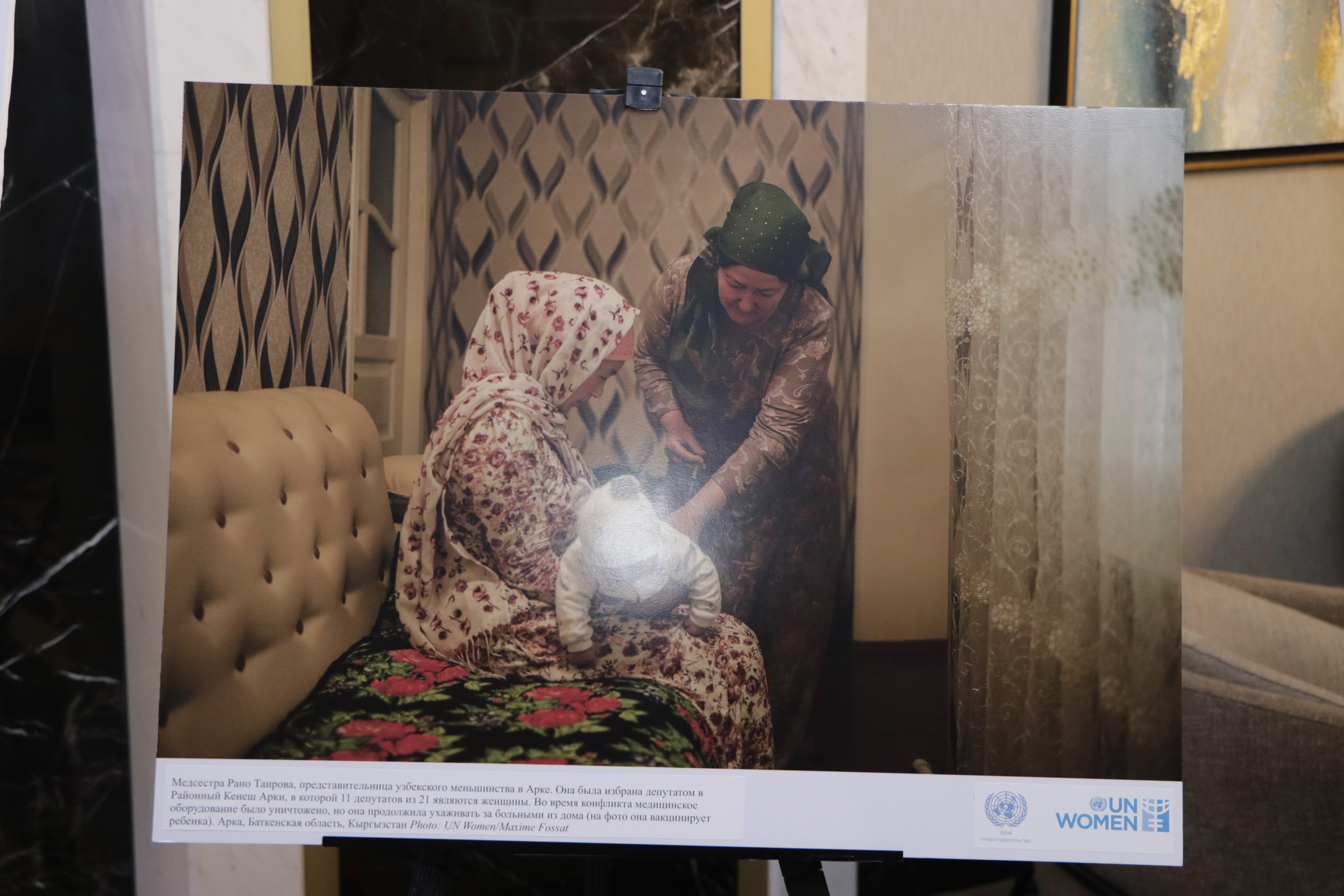 Также для участников и гостей церемонии чествования женщин-депутатов “Я женщина-лидер: Прорыв в новую эпоху” состоялось открытие выставки фотографий и картин женщин-лидеров из приграничных районов южной части Кыргызстана. Истории проиллюстрировали важность роли женщин в урегулировании конфликтов и восстановления сообществ, помимо общепризнанного вклада женщин в решение различных вопросов в области образования, здравоохранения и социального развития местных сообществ.
