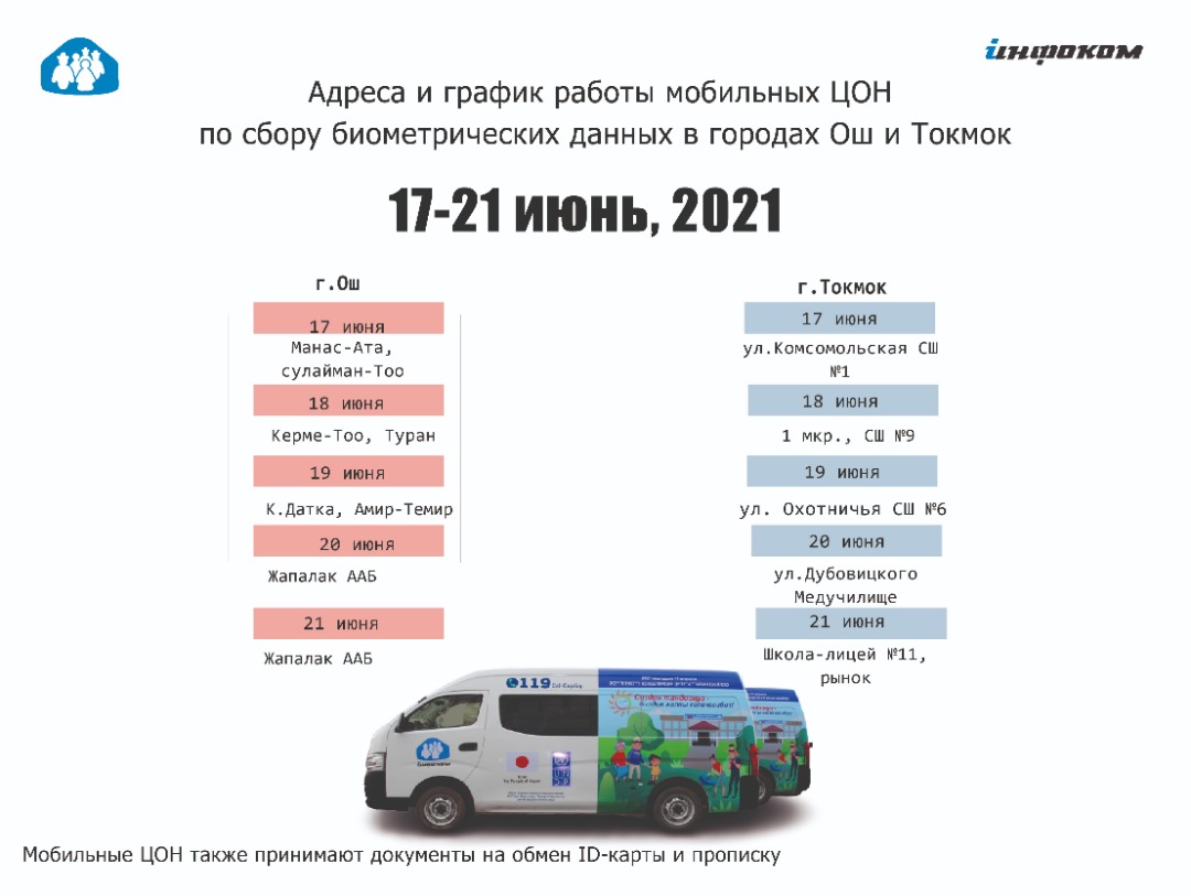 С 17 по 21 июня 2021 года в городах Бишкек, Ош и Токмок специальные микроавтобусы будут вновь принимать биометрические данные кыргызстанцев. Там же можно будет зарегистрироваться по месту проживания (прописка), подать документы на обмен паспорта.