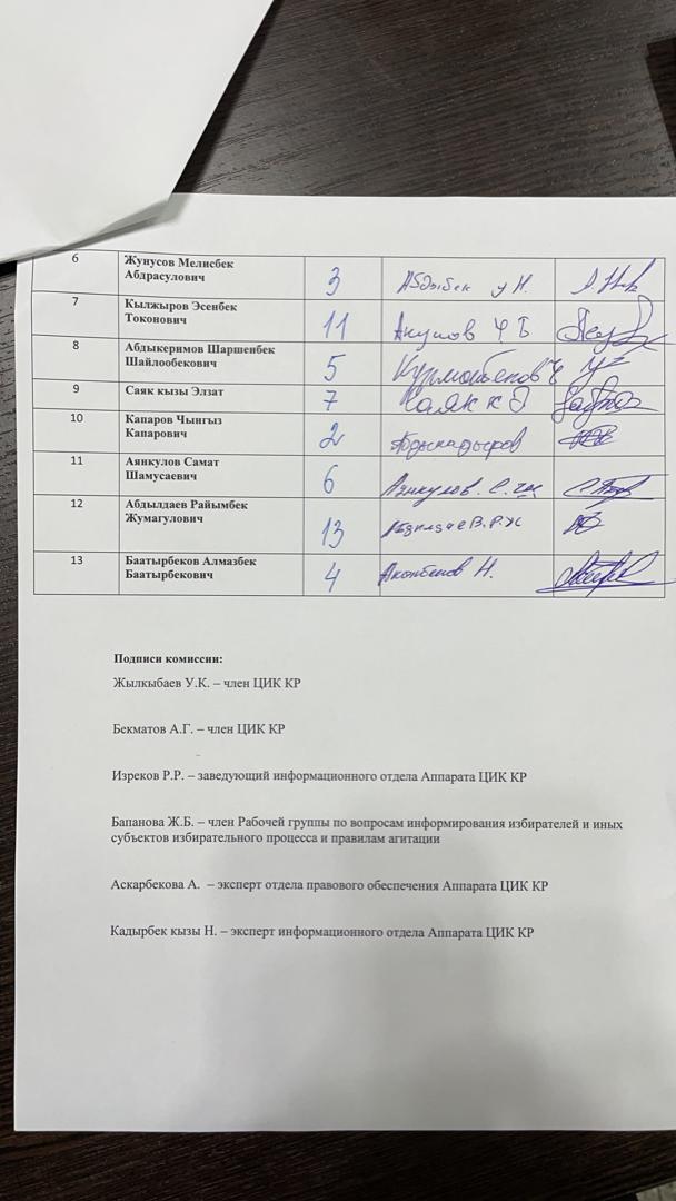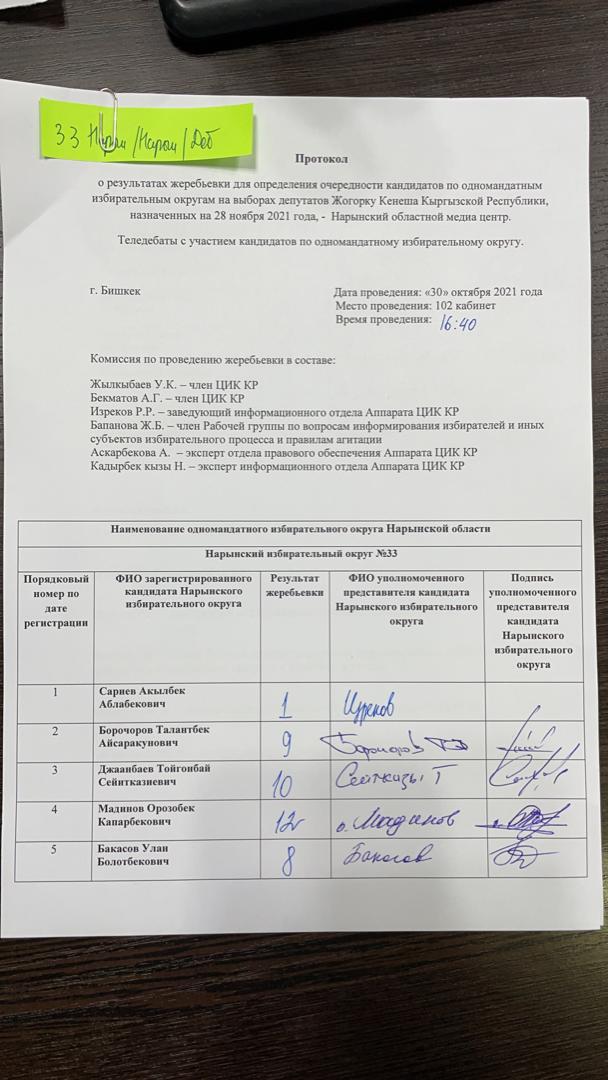 Центральная комиссия по выборам и проведению референдумов Кыргызской Республики провела жеребьевку по распределению бесплатного эфирного времени в эфире Нарынского медиа центра для кандидатов, зарегистрированных для участия на выборах депутатов Жогорку Кенеша Кыргызской Республики по одномандатным избирательным округам Нарынской области – Кокорский №32, Нарынский №33.
