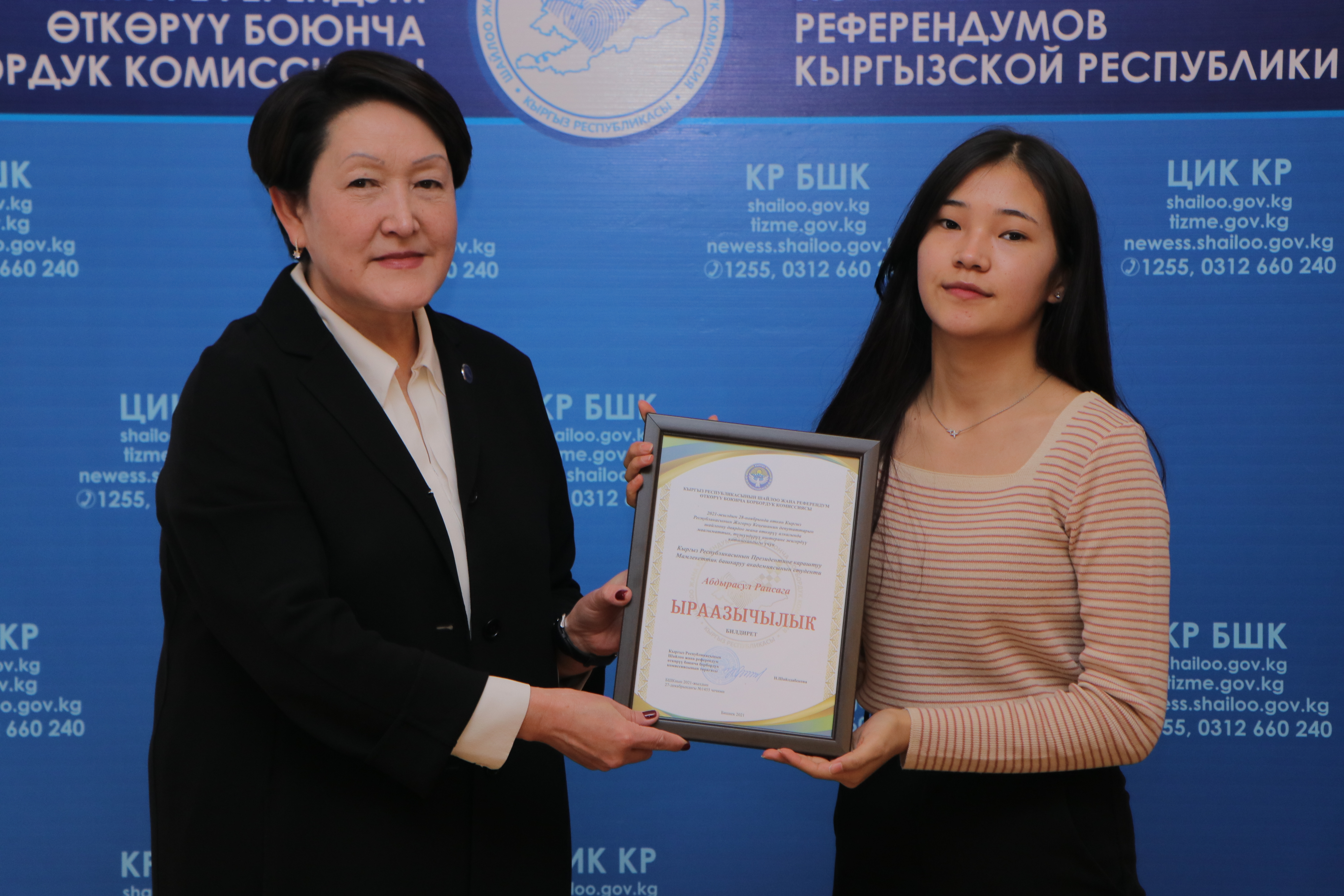 Был объявлен конкурс рисунков на тему «Молодежь и выборы» среди учеников старших классов гимназии №4 г. Бишкек. Жюри в составе представителей ЦИК У. Жылкыбаева, А. Жупуевой, Б. Дюшенбиевой выбрали лучшие 3 рисунка. Победителями стали Черикова Карина 9 «В» класс
