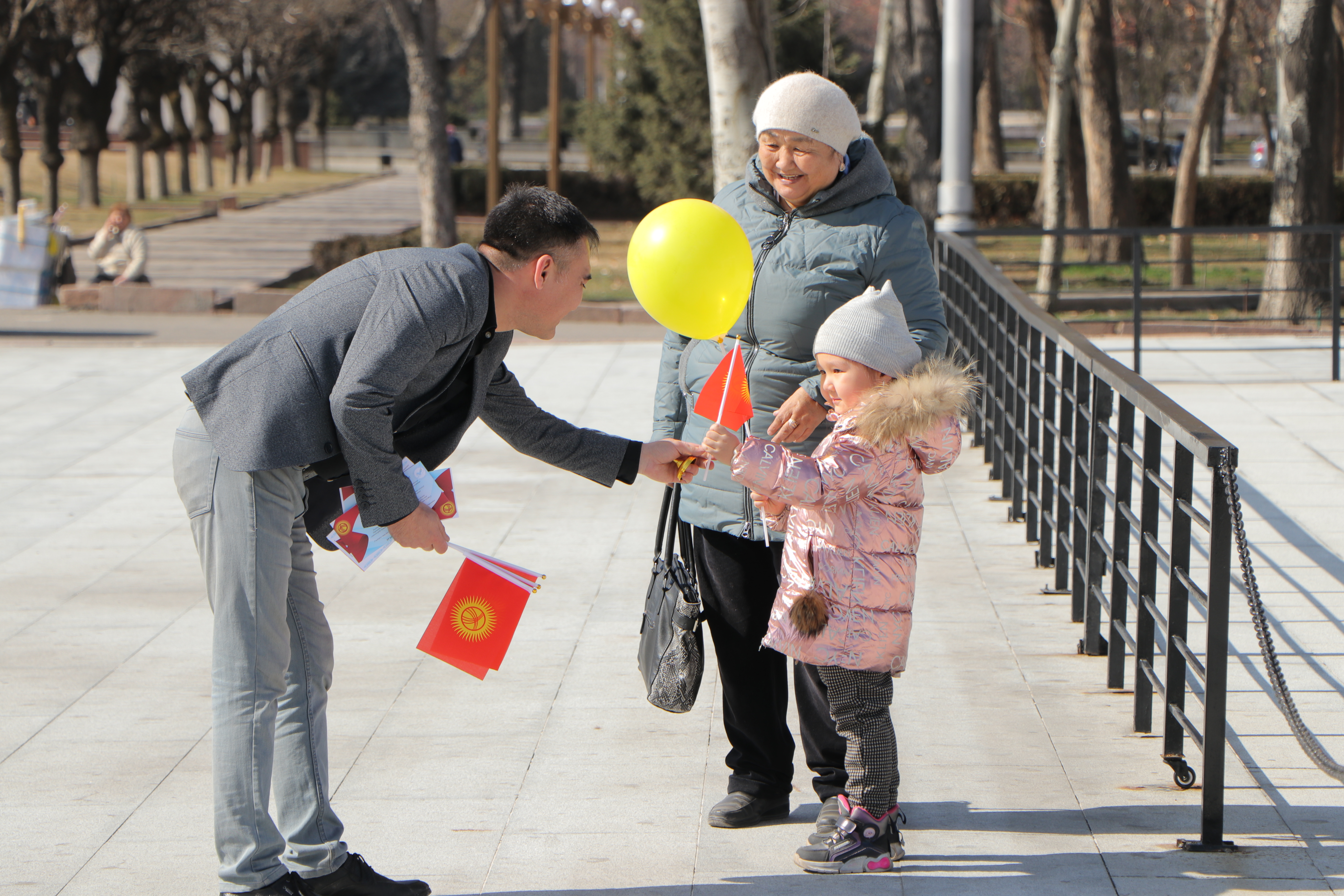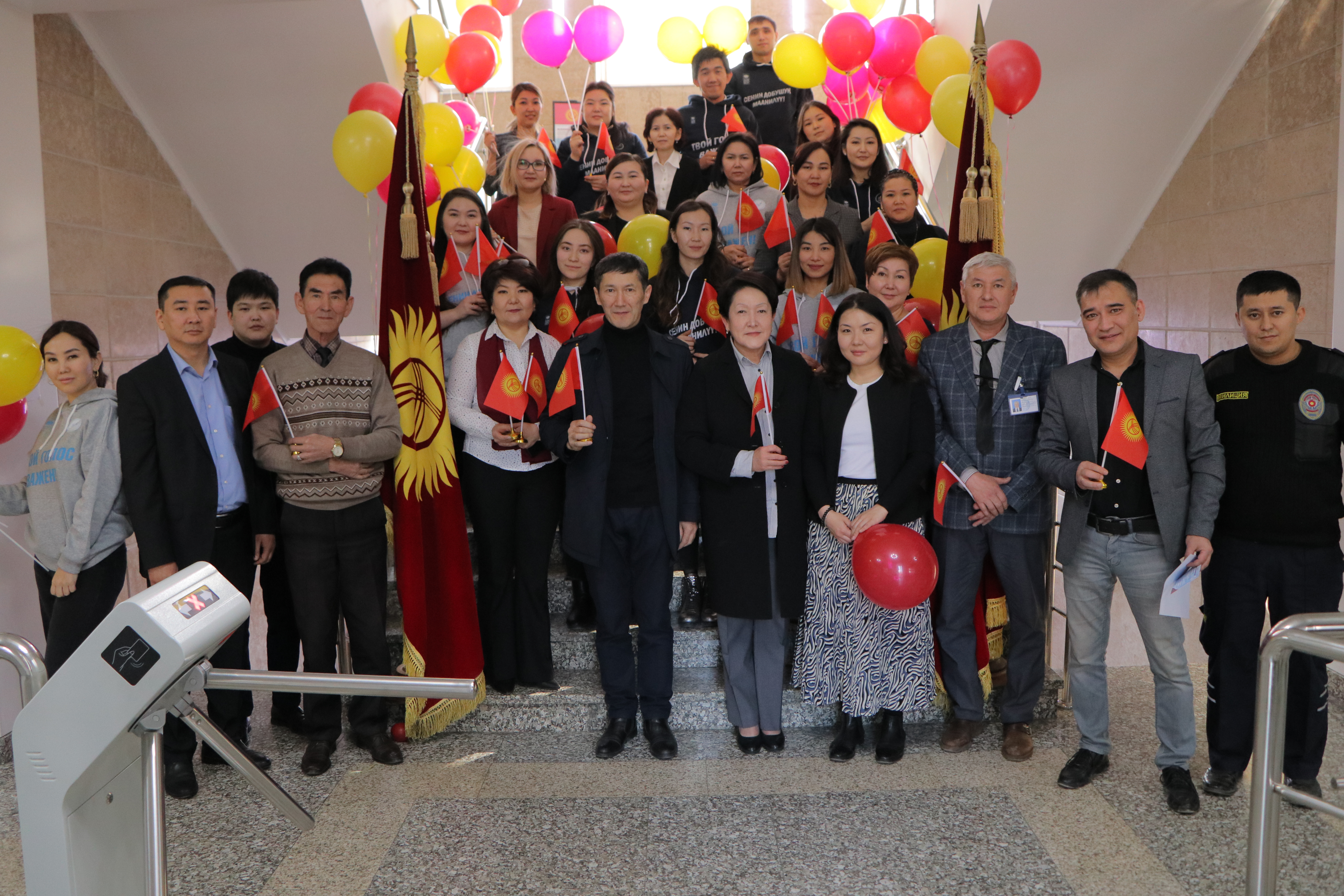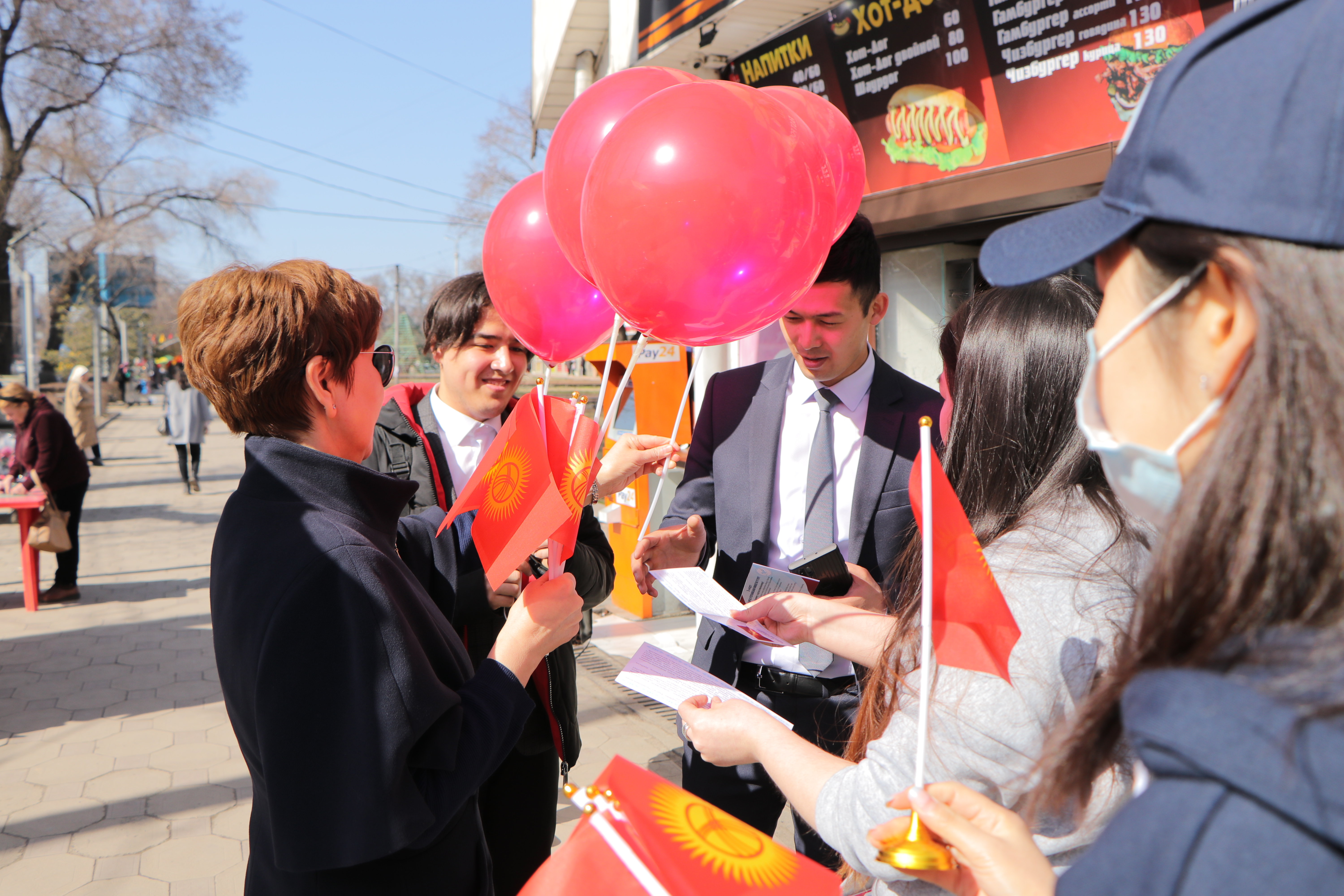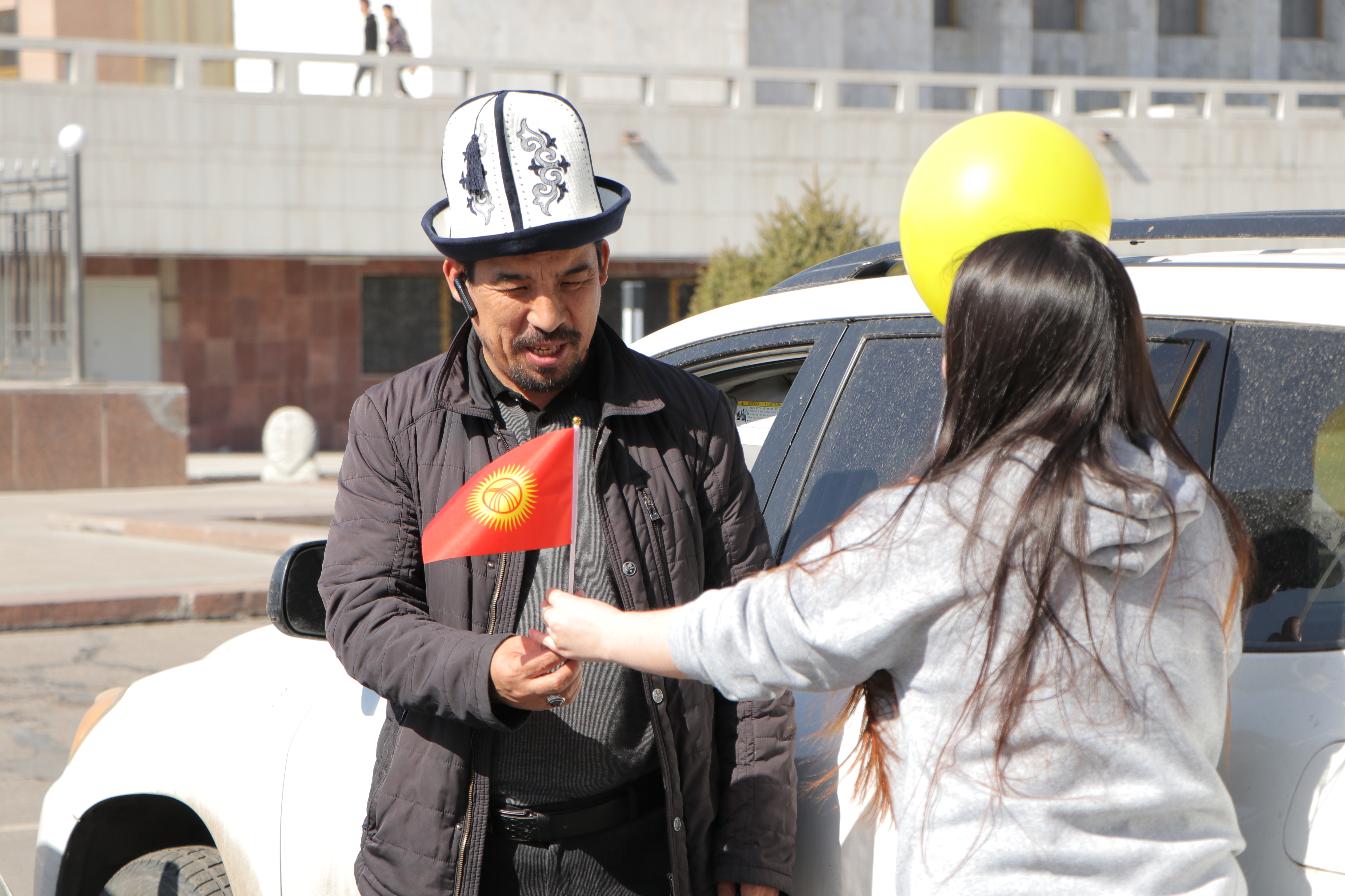 Также сотрудники аппарата ЦИК КР организовали флешмоб. На оживлённых улицах города Бишкек и на центральной площади Ала-Тоо горожанам и гостям столицы раздавали красно-желтые шары, которые передавали цветовую гамму флага, поздравительные открытки с краткой историей создания государственной символики, а также сам символ сегодняшнего праздника – флаг Кыргызской Республики.