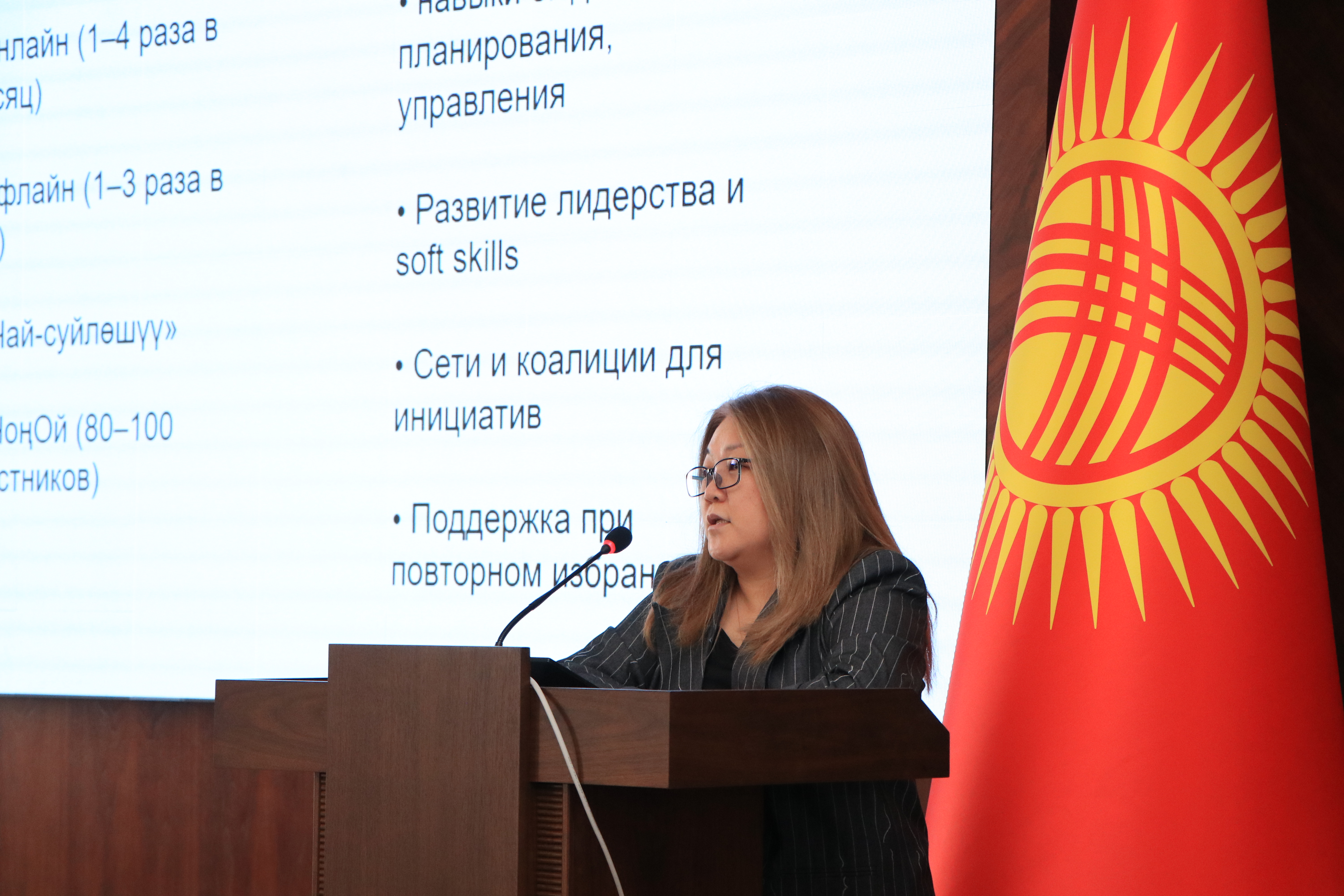 Директор Центра гражданского образования и информационных технологий при ЦИК Айсулуу Букамбаева подробно рассказала об избирательной системе Кыргызстана, представленности женщин и молодежи в выборных органах на местном и республиканском уровнях, а также о мерах по активизации участия женщин и молодежи в выборах. В Кыргызстане принимаются все меры для обеспечения равных возможностей для женщин и молодежи в политической и общественной жизни страны, создания условий для равного доступа к ресурсам, принятию решений на всех уровнях государственного управления, а также максимального использования их потенциала и вклада в развитие Кыргызстана.