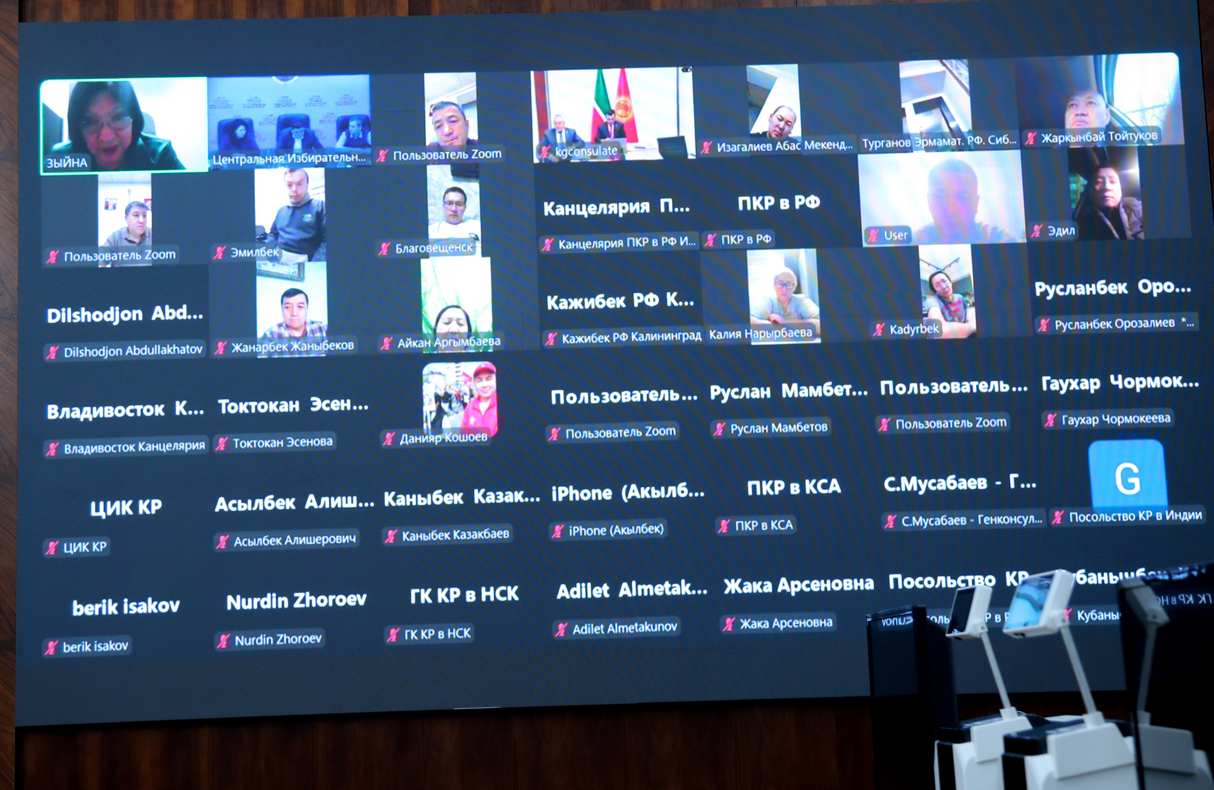 Сегодня, 14 ноября, Председатель Центральной избирательной комиссии Кыргызской Республики Тынчтык Шайназаров провёл онлайн-встречу с представителями кыргызской диаспоры, руководителями общественных объединений и гражданскими активистами, проживающими в Российской Федерации и представляющими интересы кыргызстанцев за рубежом.