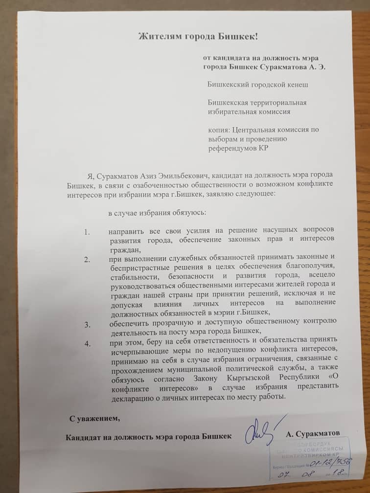 Ошол эле учурда Бишкек АШКга Бишкек шаарынын мэринин кызмат ордуна талапкер А.Суракматовдун Бишкек шаарынын калкына кайрылуусу (кайрылууда көрсөтүлгөндөй, Бишкек шаардык кеңешине жана КР БШКга да жөнөтүлгөн) келип түштү.