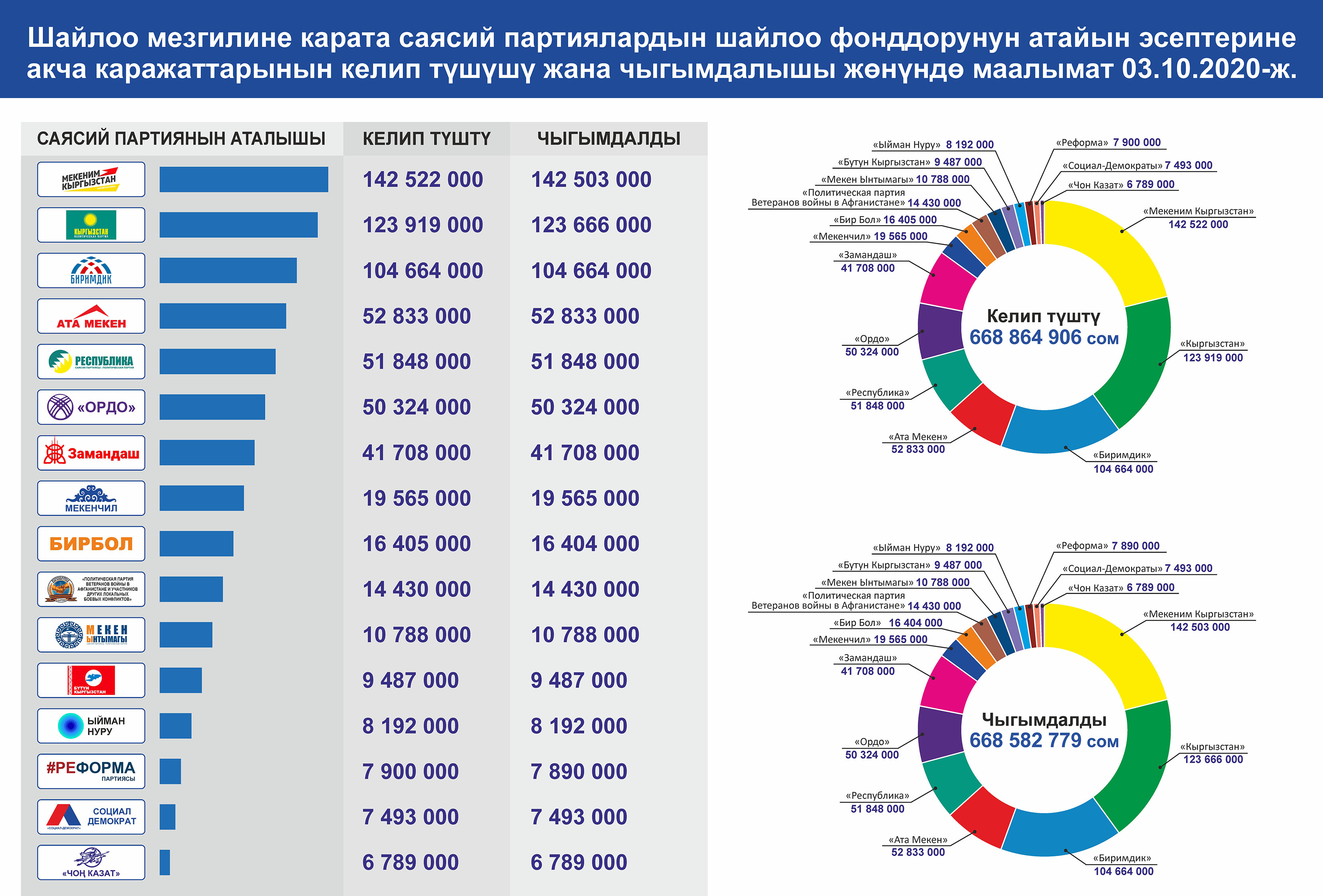 Саясий партиялардын 2020-жылдын 3-октябрындагы финансылык отчетуна ылайык, саясий партиялардын шайлоо фонддоруна жалпы суммасы 547,73 миллион сом акча каражаты келип түшкөн, анын 542,51 миллион сому мыйзамдарда белгиленген тартипте алынган.