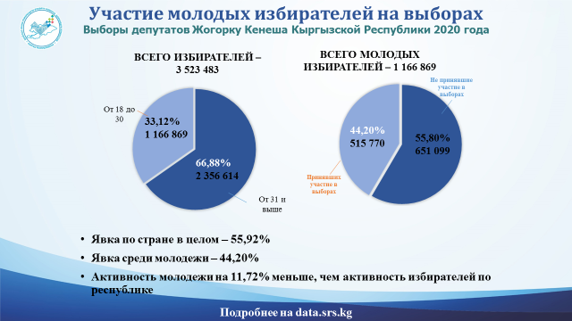 “Алардын ичинен 1 045 443 шайлоочу 18ден 29 жашка чейин, 853 659 шайлоочу 30дан 39 жашка чейин, 604 195 шайлоочу 50 жашка чейин. Ошол эле учурда 2017-жылы болгон КР Президентин шайлоодо өлкө боюнча 56,32% шайлоого катышуу болсо, жаштардын катышуусу болгону 41,56% болгон, башкача айтканда жаштардын активдүүлүгү жашы өткөн адамдарга караганда 15%га аз болгон”.