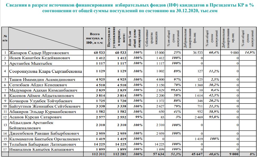 Талапкерлердин каржы отчеттуулугунун маалыматтары боюнча 2020-жылдын 30-декабрына карата шайлоо фонддоруна түшкөн акча каражаттары 112 310 964 сомду түздү, анын ичинде: