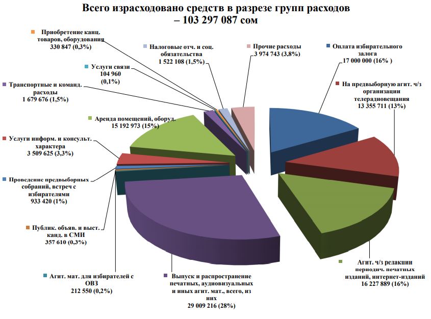 КР Президентине талапкерлердин шайлоо фонддорунун каражаттарынан шайлоо өнөктүктөрүн өткөрүүгө байланыштуу чыгашаларды жабууга 103 297 087 сом чыгымдалды, анын ичинде: