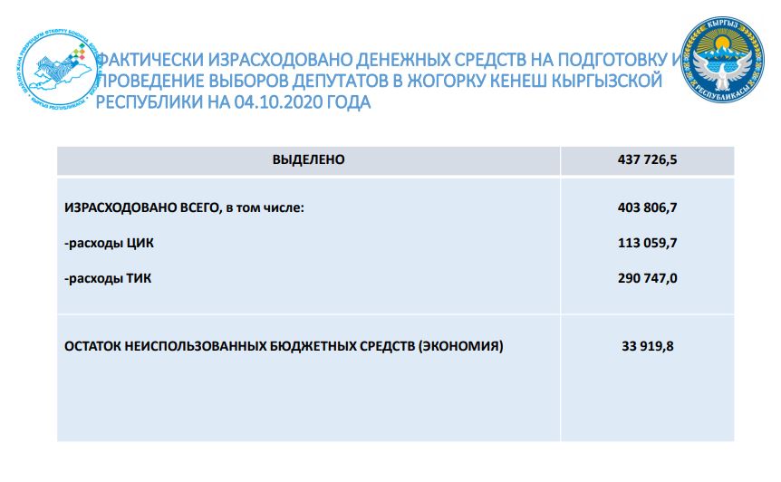 2020-жылы 4-октябрда өткөн Кыргыз Республикасынын Жогорку Кеңешинин депутаттарын шайлоону Кыргыз Республикасынын республикалык бюджетинин каражаттарынан иш жүзүндө каржылоо403 806,746 сомду түздү. Пайдаланылбаган бюджеттик каражаттардын калдыгы (үнөм) 33 919,8 сомду түздү.