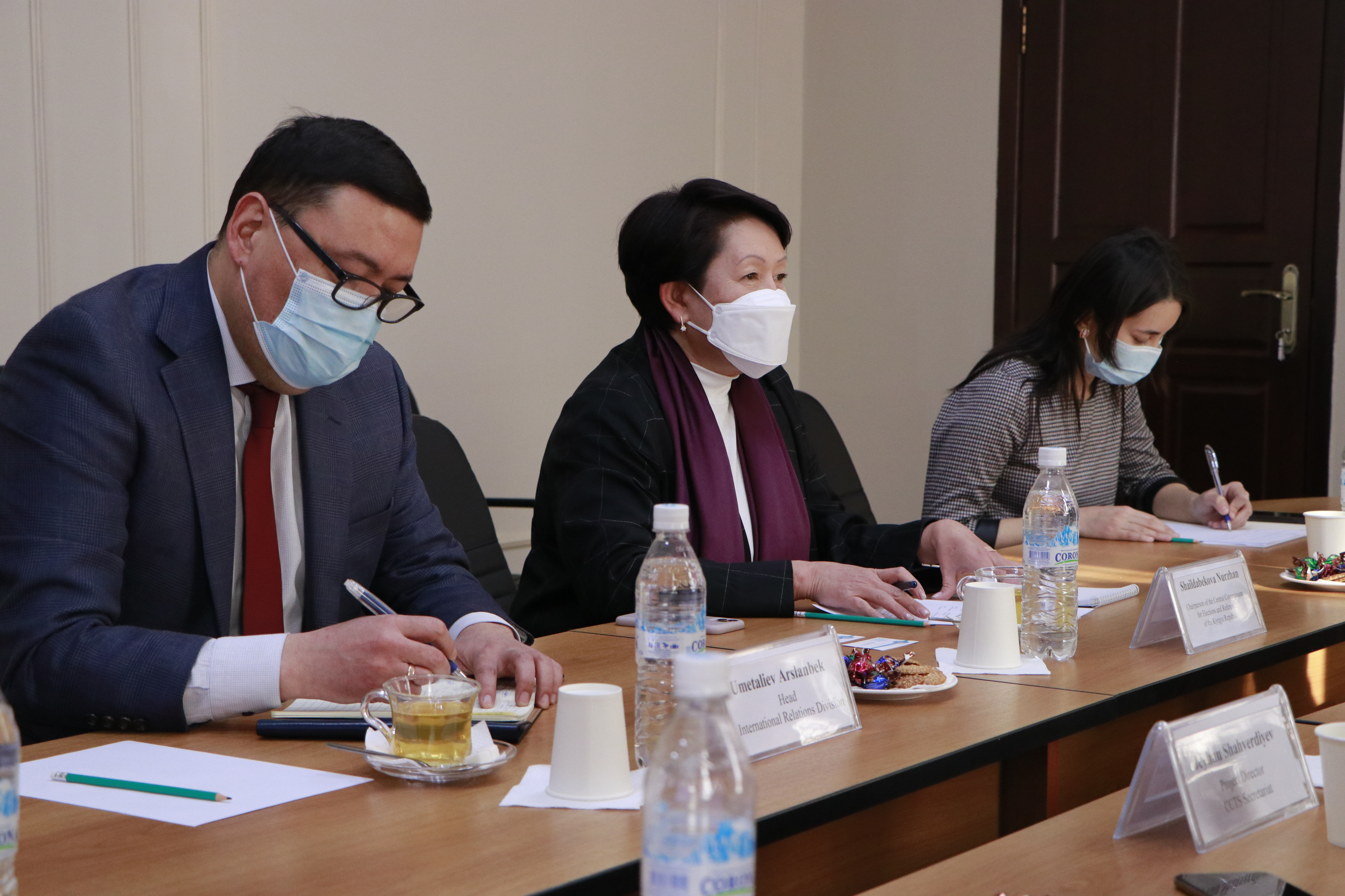 ТТМК башкы катчысынын орун басары, миссиянын башчысы Мирвохид Азимов менен жолугушууда БШК төрайымы Н. Шайлдабекова 2021-жылдын 10-январына дайындалган КР Президентин мөөнөтүнөн мурда шайлоо жана КР референдумуна даярдыктын жүрүшү жөнүндө айтып берди.