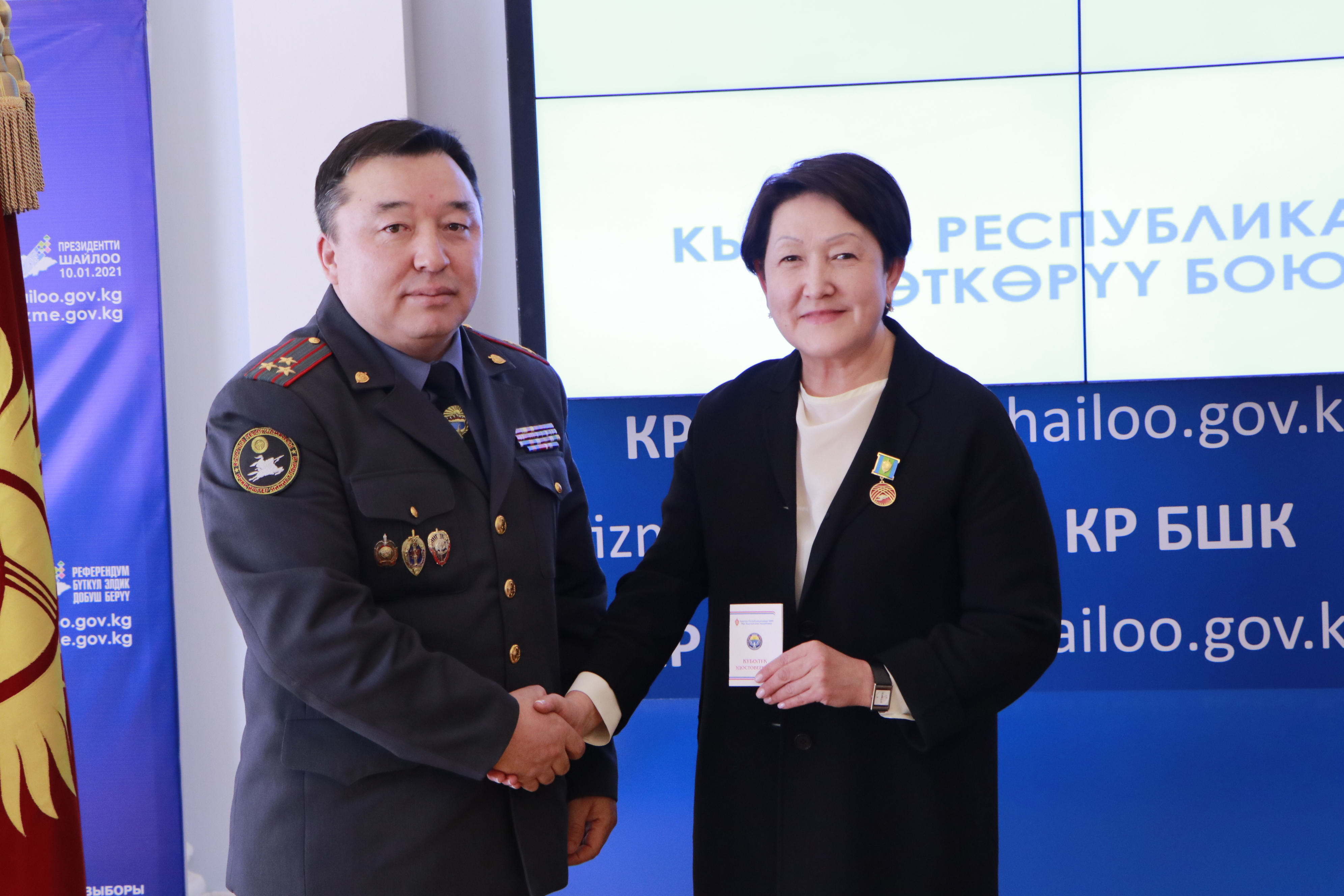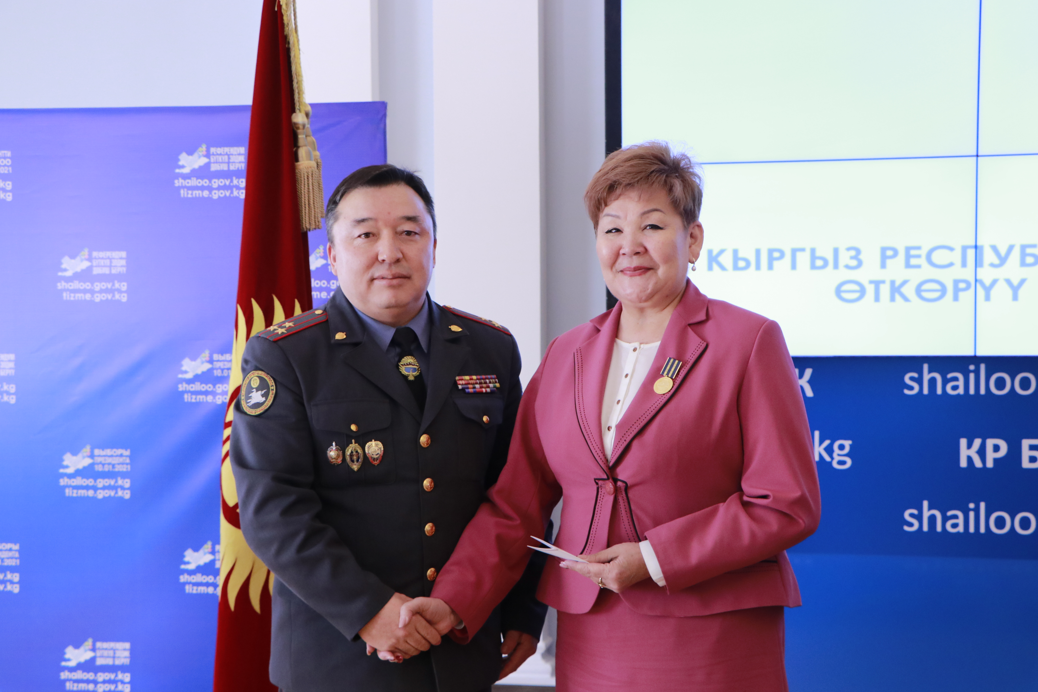 Кыргыз Республикасынын Ички иштер министрлиги Кыргыз Республикасынын Шайлоо жана референдум өткөрүү боюнча борбордук комиссиясынын төрагасы Нуржан Шайлдабекованы “Датка айым” төш белгиси менен сыйлады.