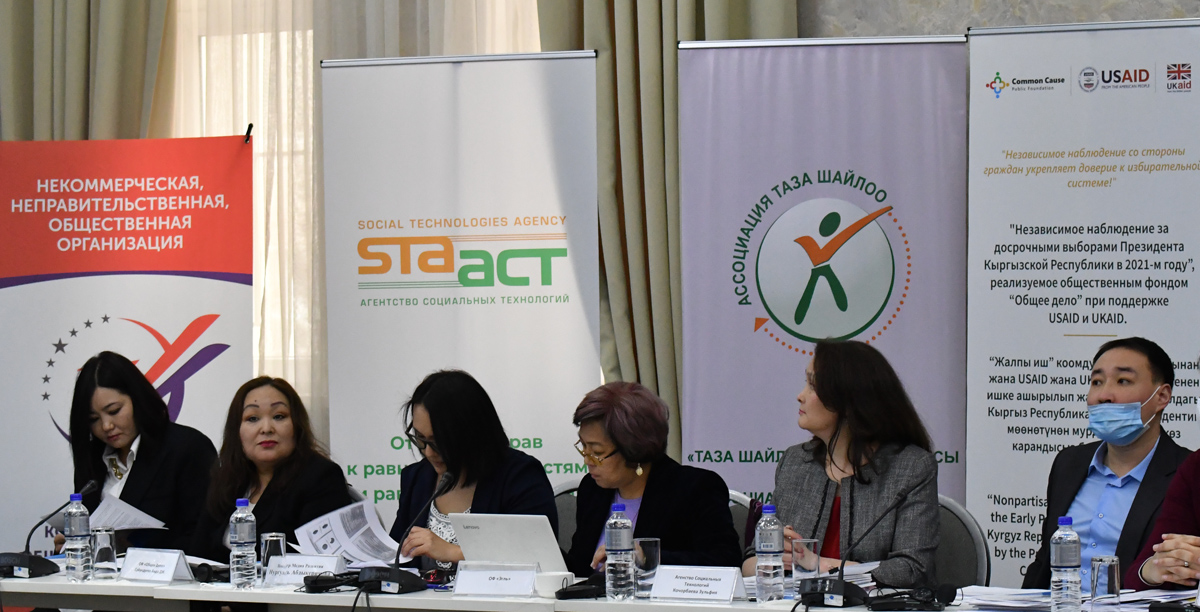"Социалдык технологиялар агенттигинин" аткаруучу директору Зульфия Көчөрбаева “Кыргыз Республикасынын Президентин шайлоого гендердик мониторинг жүргүзүүнүн жыйынтыктары” презентациясында өткөн шайлоолордогу гендердик теңсиздикке тынчсыздануусун билдирди. "Айрым категориялардын шайлоочулары" үчүн, башкача айтканда ден соолугунан кемтилгеси бар жарандар үчүн шайлоо кандай өткөндүгүн "Эгль" КФ укуктук эксперти Мирлан Медетов айтып берип, алар үчүн шарттар жакшыргандыгын белгиледи.
