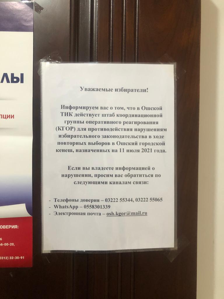 3. Шайлоочулар, ошондой эле шайлоо процессинин баардык субъектилери шайлоо мыйзамдарын бузуулардын фактылары тууралуу өз убагында маалымдоо үчүн Ош жана Токмок шаарларынын АШКларынын ЫЧКТ штабдарына төмөнкү байланыш телефондору аркылуу кайрылса болот: