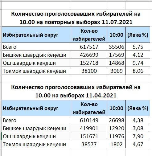 Кыргыз Республикасынын Шайлоо жана референдум ѳткѳрүү боюнча борбордук комиссиясынын маалыматы боюнча Бишкек, Ош жана Токмок шаарларынын кеңештеринин депутаттарын кайталап шайлоого шайлоочулардын саат 10.00гө карата добуш берүүгө келүүсү ушул эле шаарлардагы 2021-жылдын апрелиндеги шайлоого шайлоочулардын бул убакытка карата добуш берүүгө келүүдөн ашты.