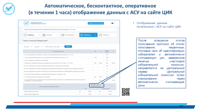 Добуш берүүнүн жыйынтыктары угуза окулгандан кийин участкалык шайлоо комиссиясынын мөөрү менен күбөлөндүрүлгөн добуш берүүнүн жыйынтыктары жөнүндө протокол, шайлоочуларды идентификациялоо жөнүндө баштапкы, жыйынтыктоочу чектер Борбордук шайлоо комиссиясынын борбордук серверине автоматтык эсептөөчү урналар аркылуу сканерлөө жолу менен жөнөтүлөт.