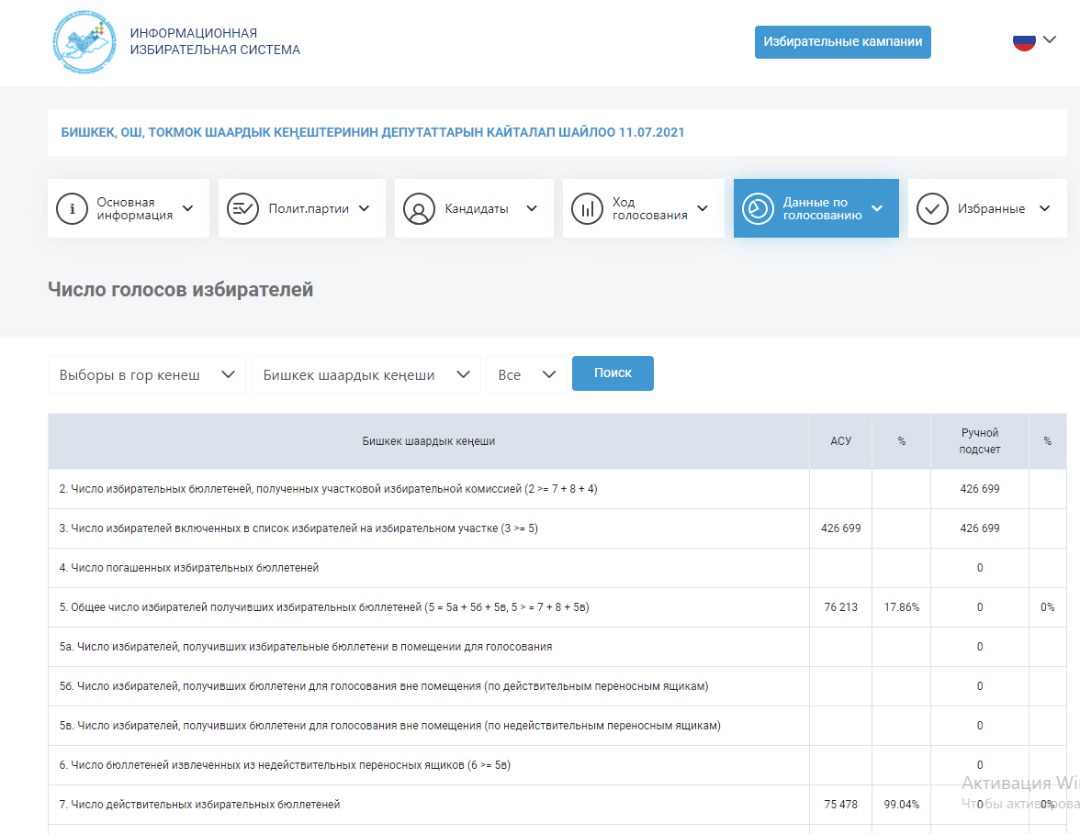 Добуш берүүнүн алдын ала жыйынтыктары Кыргыз Республикасынын Шайлоо жана референдум ѳткѳрүү боюнча борбордук комиссиясынын электрондук ресурстарында, анын ичинде Маалыматтык шайлоо тутумунда https://newess.shailoo.gov.kg/ru/ шилтемеси боюнча жеткиликтүү болот.
