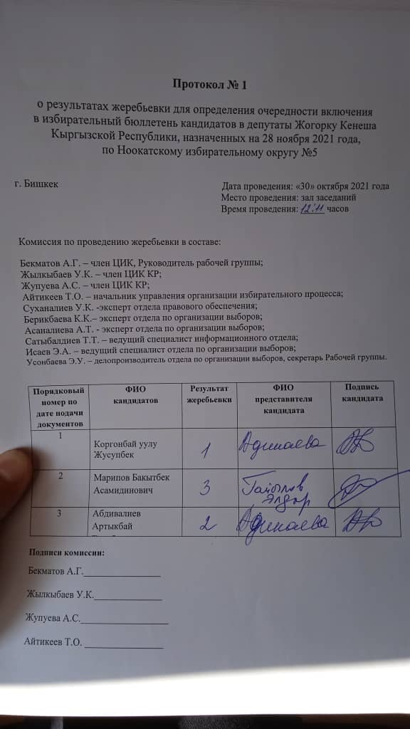 Кыргыз Республикасынын Шайлоо жана референдум өткөрүү боюнча борбордук комиссиясы 2021-жылдын 28-ноябрына дайындалган Кыргыз Республикасынын Жогорку Кеңешинин депутаттарын шайлоодо №5 Ноокат шайлоо округу боюнча шайлоо бюллетенинде талапкерлердин орундарын аныктоо боюнча чүчүкулак өткөрдү.