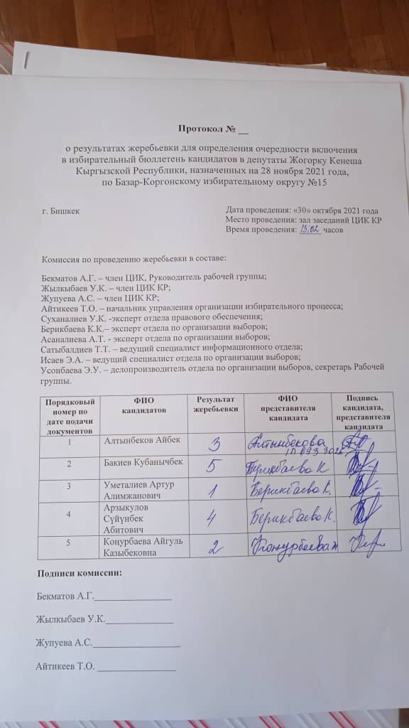 Кыргыз Республикасынын Шайлоо жана референдум өткөрүү боюнча борбордук комиссиясы 2021-жылдын 28-ноябрына дайындалган Кыргыз Республикасынын Жогорку Кеңешинин депутаттарын шайлоодо №15 Базар-Коргон шайлоо округу боюнча шайлоо бюллетенинде талапкерлердин орундарын аныктоо боюнча чүчүкулак өткөрдү.