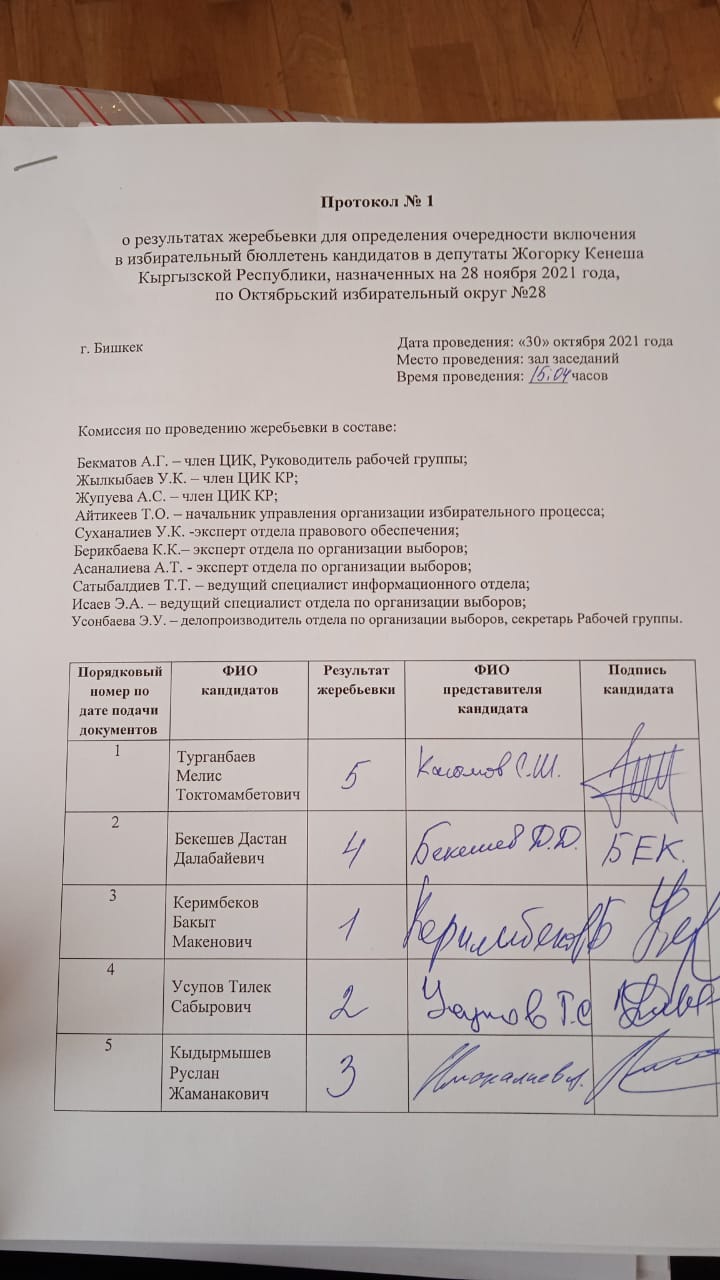 Кыргыз Республикасынын Шайлоо жана референдум өткөрүү боюнча борбордук комиссиясы 2021-жылдын 28-ноябрына дайындалган Кыргыз Республикасынын Жогорку Кеңешинин депутаттарын шайлоодо №28 Октябрь шайлоо округу боюнча шайлоо бюллетенинде талапкерлердин орундарын аныктоо боюнча чүчүкулак өткөрдү.