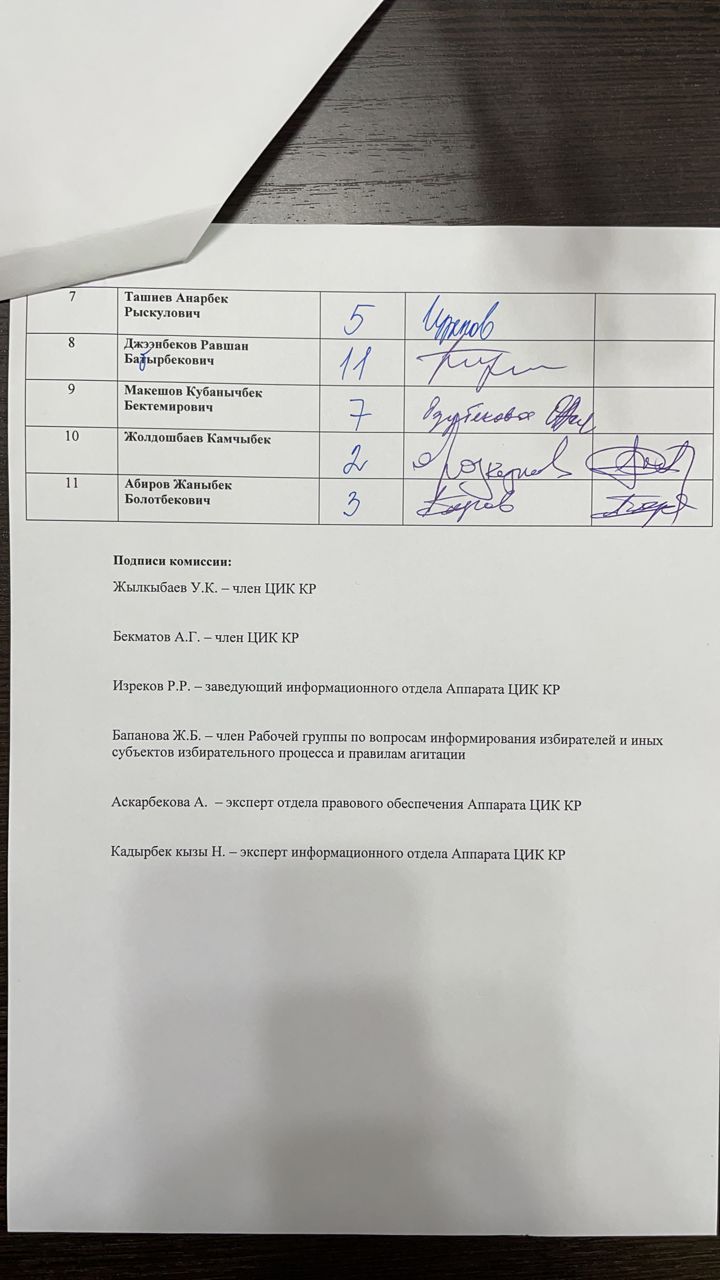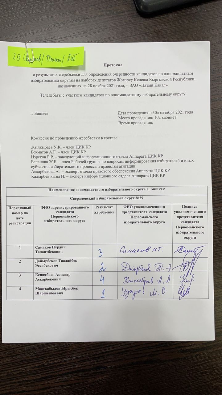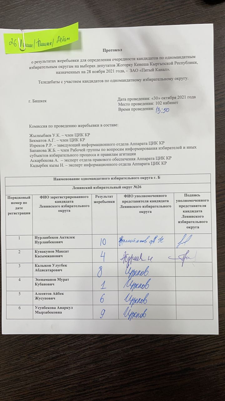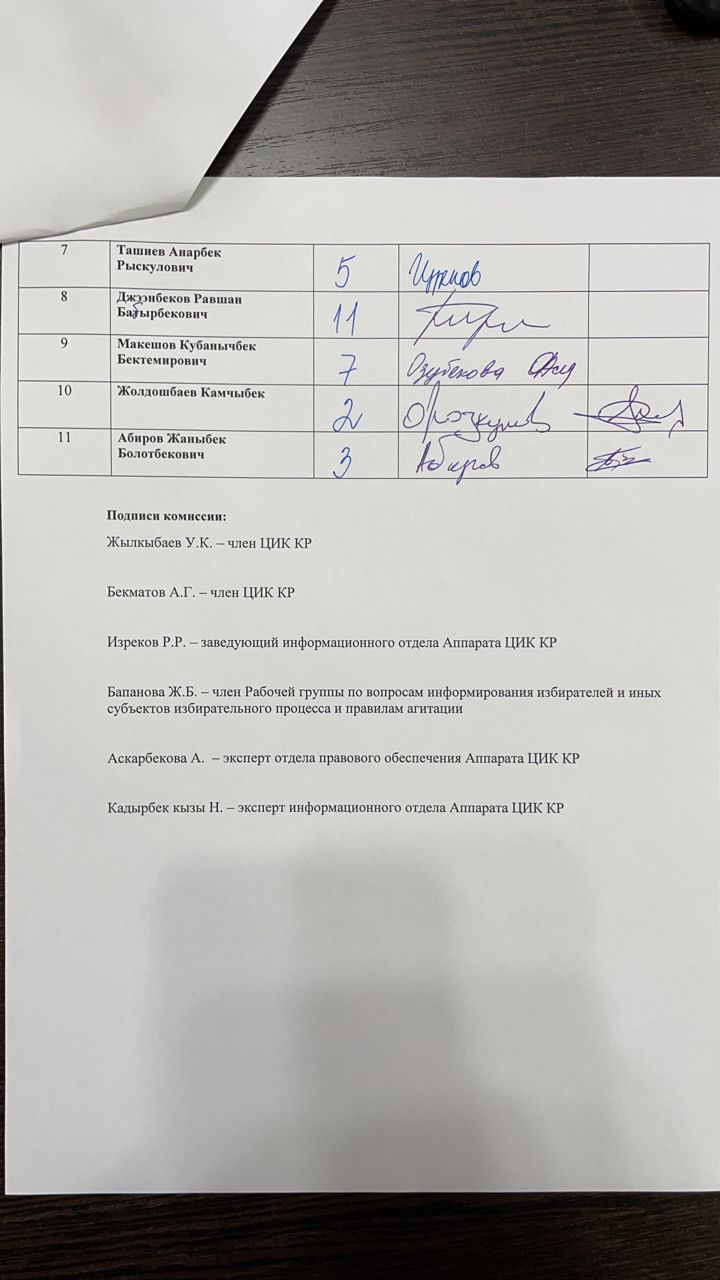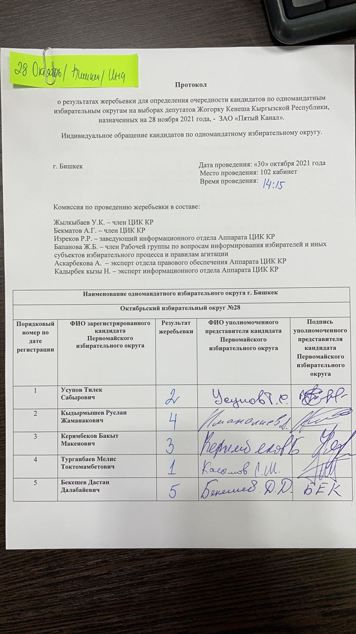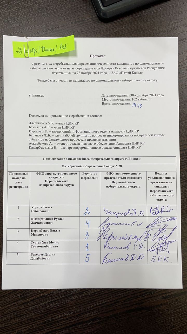 Кыргыз Республикасынын Шайлоо жана референдум өткөрүү боюнча борбордук комиссиясы Чүй облусунун №26 Ленин, №27 Биринчи май, №28 Октябрь, №29 Свердлов бир мандаттуу шайлоо округдары боюнча Кыргыз Республикасынын Жогорку Кеңешинин депутаттарын шайлоого катышуу үчүн катталган талапкерлерге Бешинчи каналда акысыз обо убактысын бөлүштүрүү боюнча чүчүкулак өткөрдү.