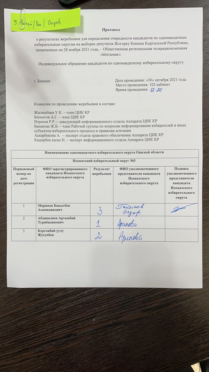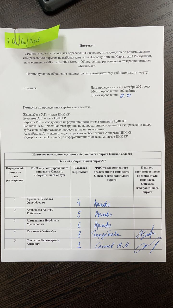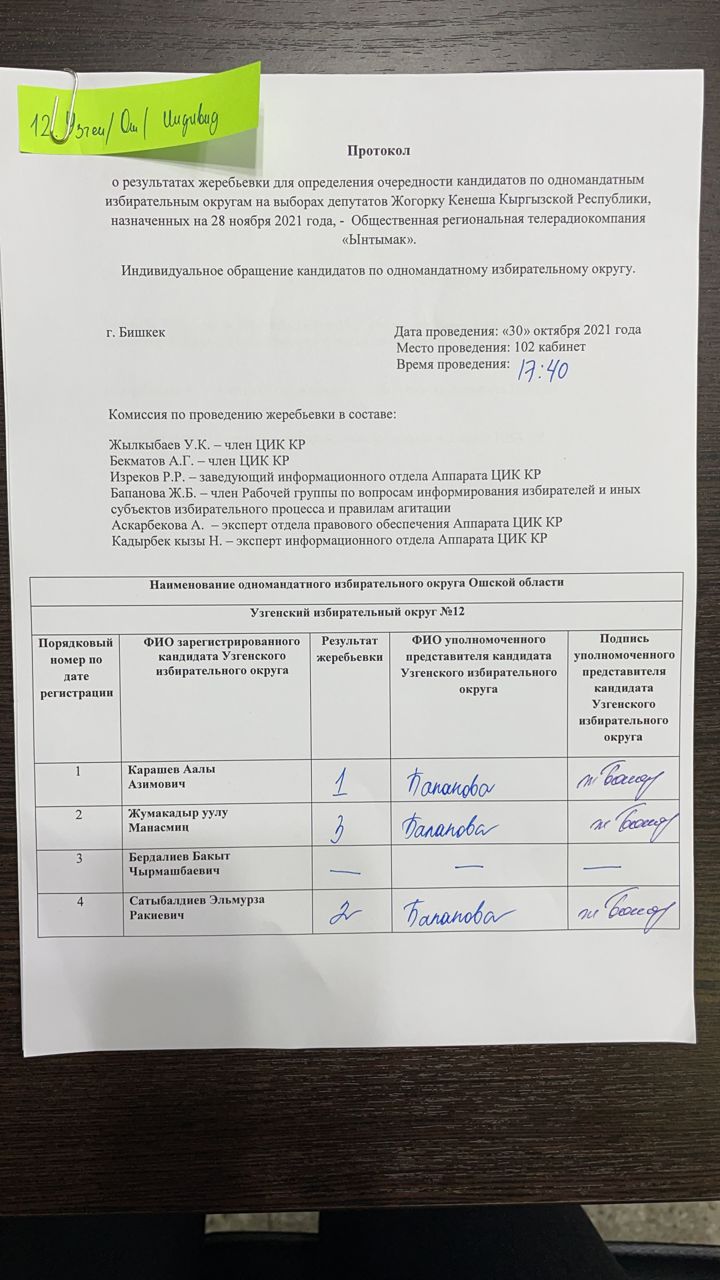 Кыргыз Республикасынын Шайлоо жана референдум өткөрүү боюнча борбордук комиссиясы Ош облусунун №4 Көк-Жар, №5 Ноокат, №6 Араван, №7 Ош, №8 Төлөйкөн, №9 Кара-Суу, №10 Куршаб, №11 Алай, №12 Өзгөн бир мандаттуу шайлоо округдары боюнча Кыргыз Республикасынын Жогорку Кеңешинин депутаттарын шайлоого катышуу үчүн катталган талапкерлерге ТРК "Ынтымак" акысыз обо убактысын бөлүштүрүү боюнча чүчүкулак өткөрдү.