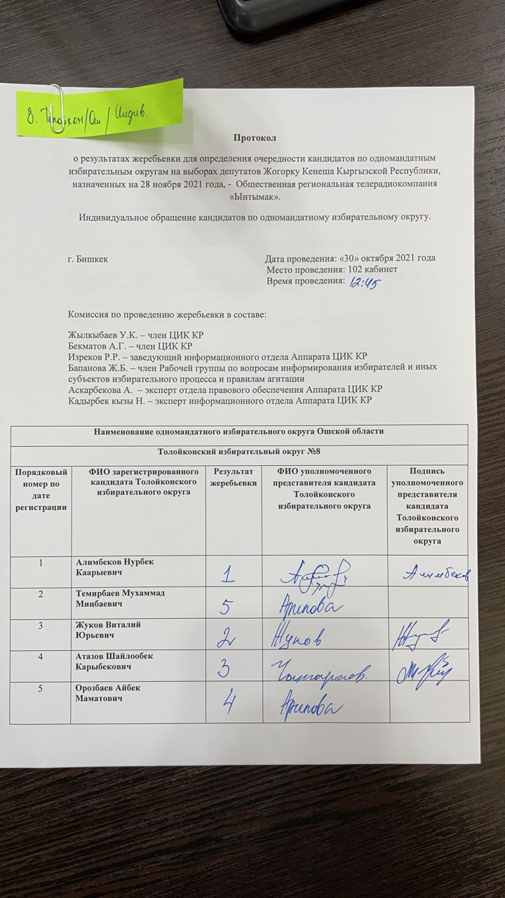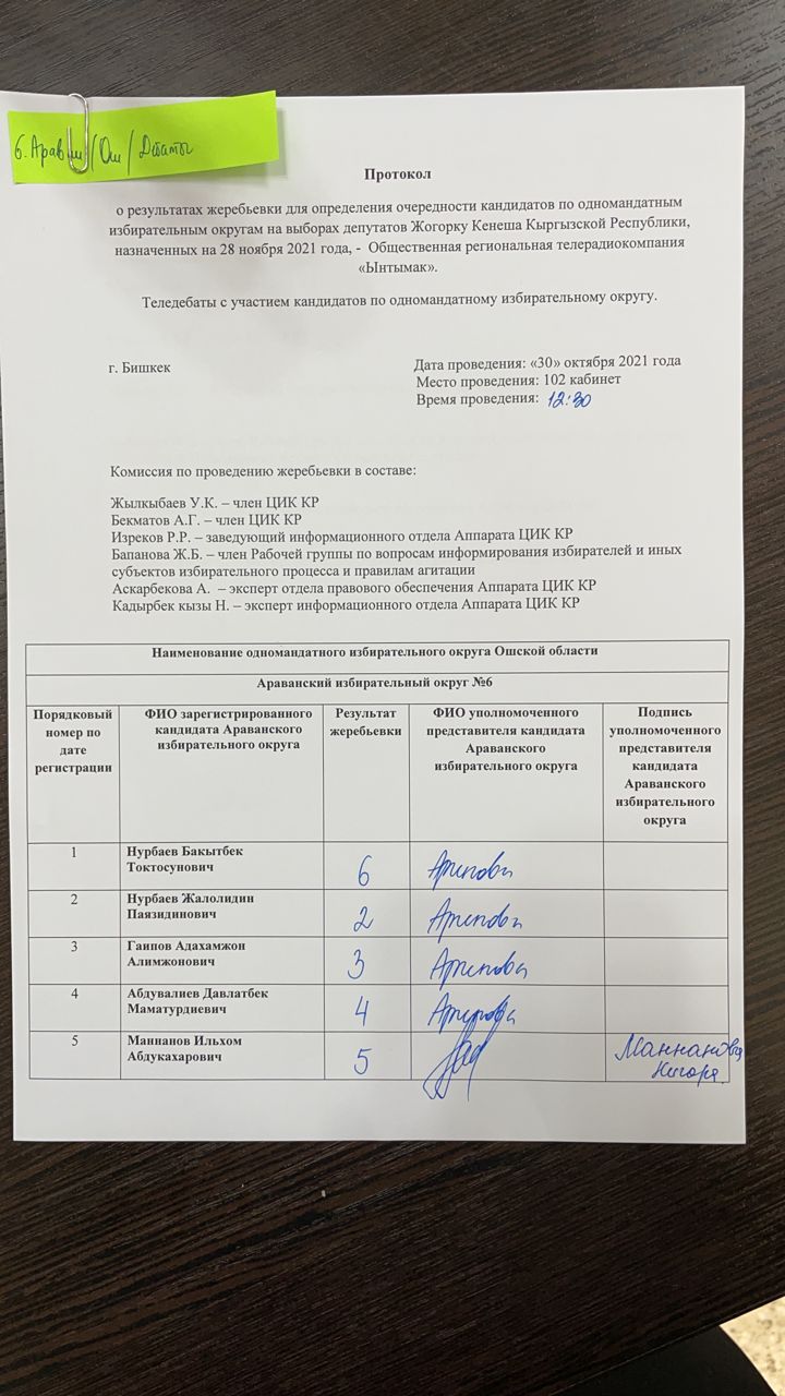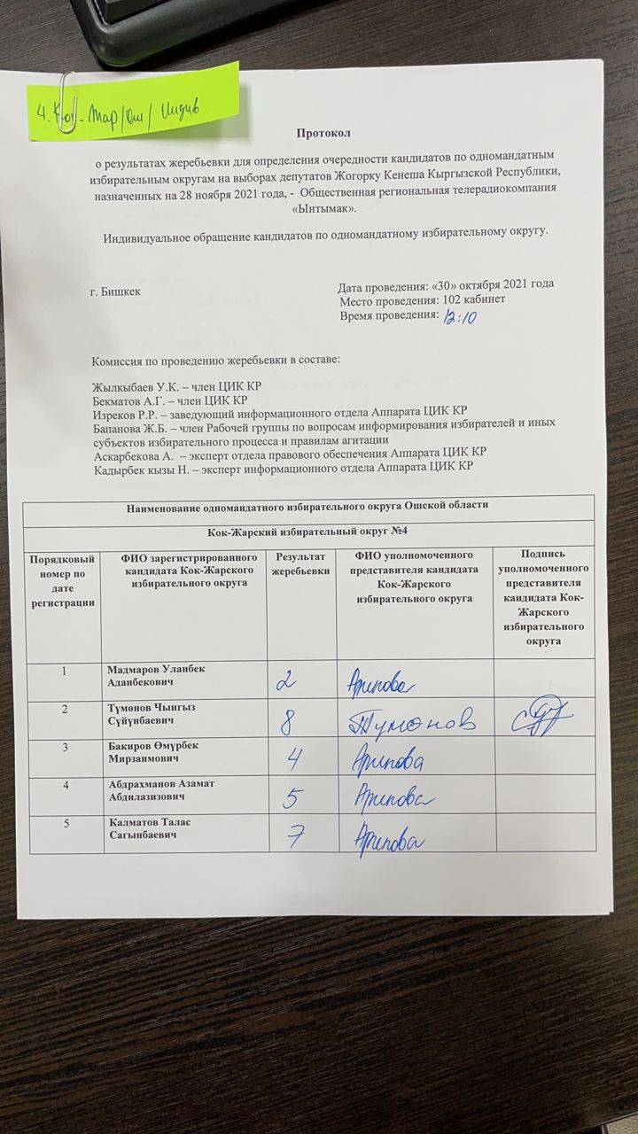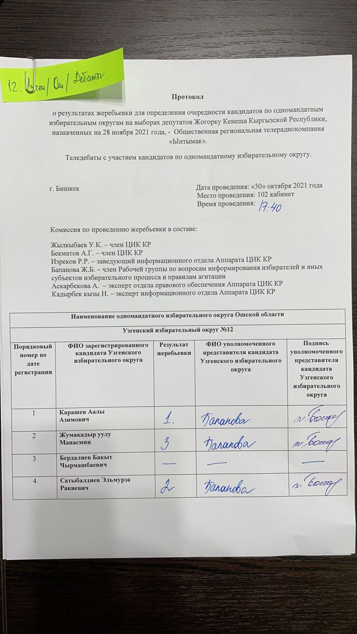 Кыргыз Республикасынын Шайлоо жана референдум өткөрүү боюнча борбордук комиссиясы Ош облусунун №4 Көк-Жар, №5 Ноокат, №6 Араван, №7 Ош, №8 Төлөйкөн, №9 Кара-Суу, №10 Куршаб, №11 Алай, №12 Өзгөн бир мандаттуу шайлоо округдары боюнча Кыргыз Республикасынын Жогорку Кеңешинин депутаттарын шайлоого катышуу үчүн катталган талапкерлерге ТРК "Ынтымак" акысыз обо убактысын бөлүштүрүү боюнча чүчүкулак өткөрдү.