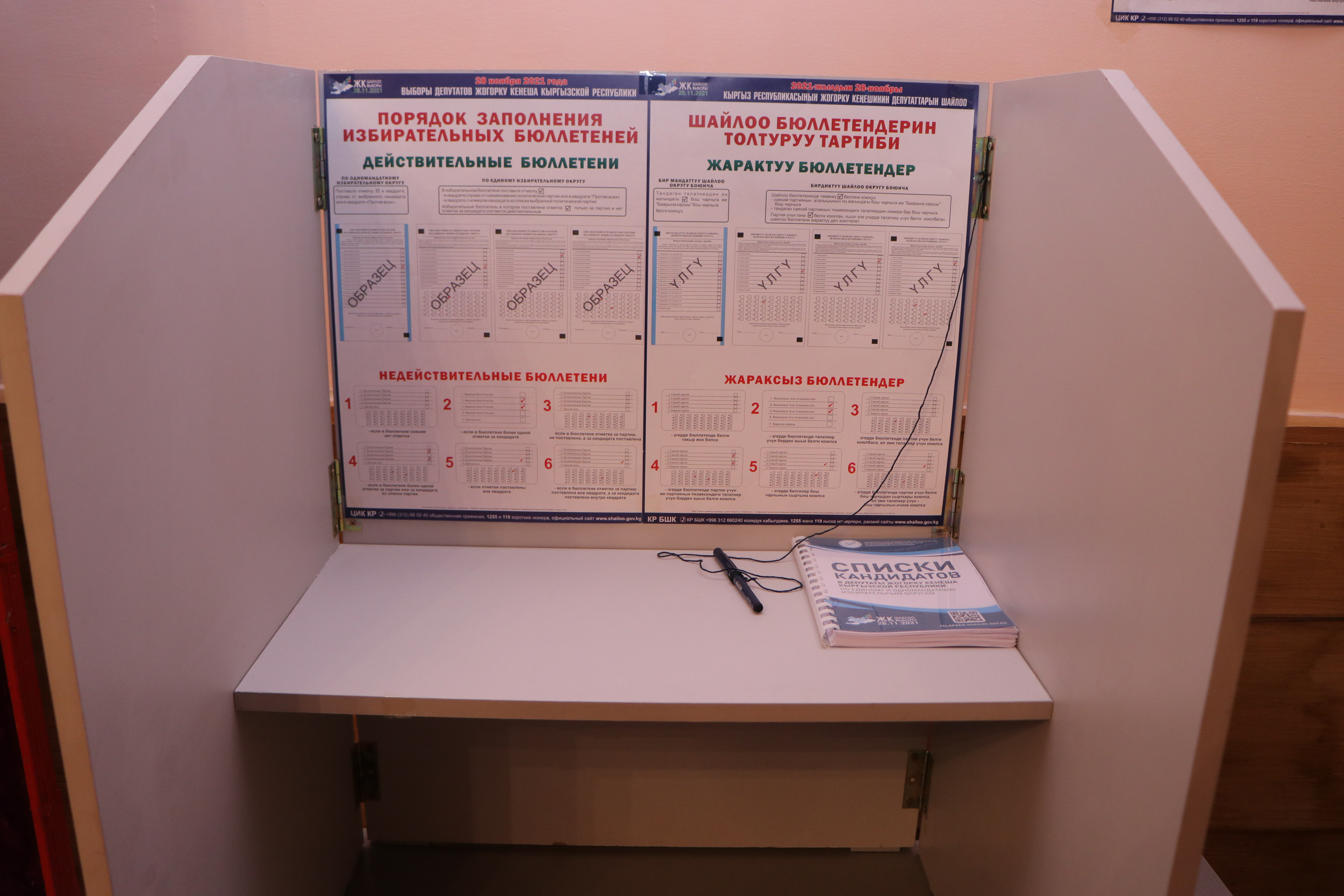 Байкоочулар добуш берүүчү кабиналарда чүчү кулак менен аныкталган кезекте бардык талапкерлер, саясий партиялар тууралуу маалыматтык материалдар; ар бир талапкердин катар номери көрсөтүлгөн ар бир партиянын талапкерлеринин тизмеси жайгаштырылгандыгын көрүштү.