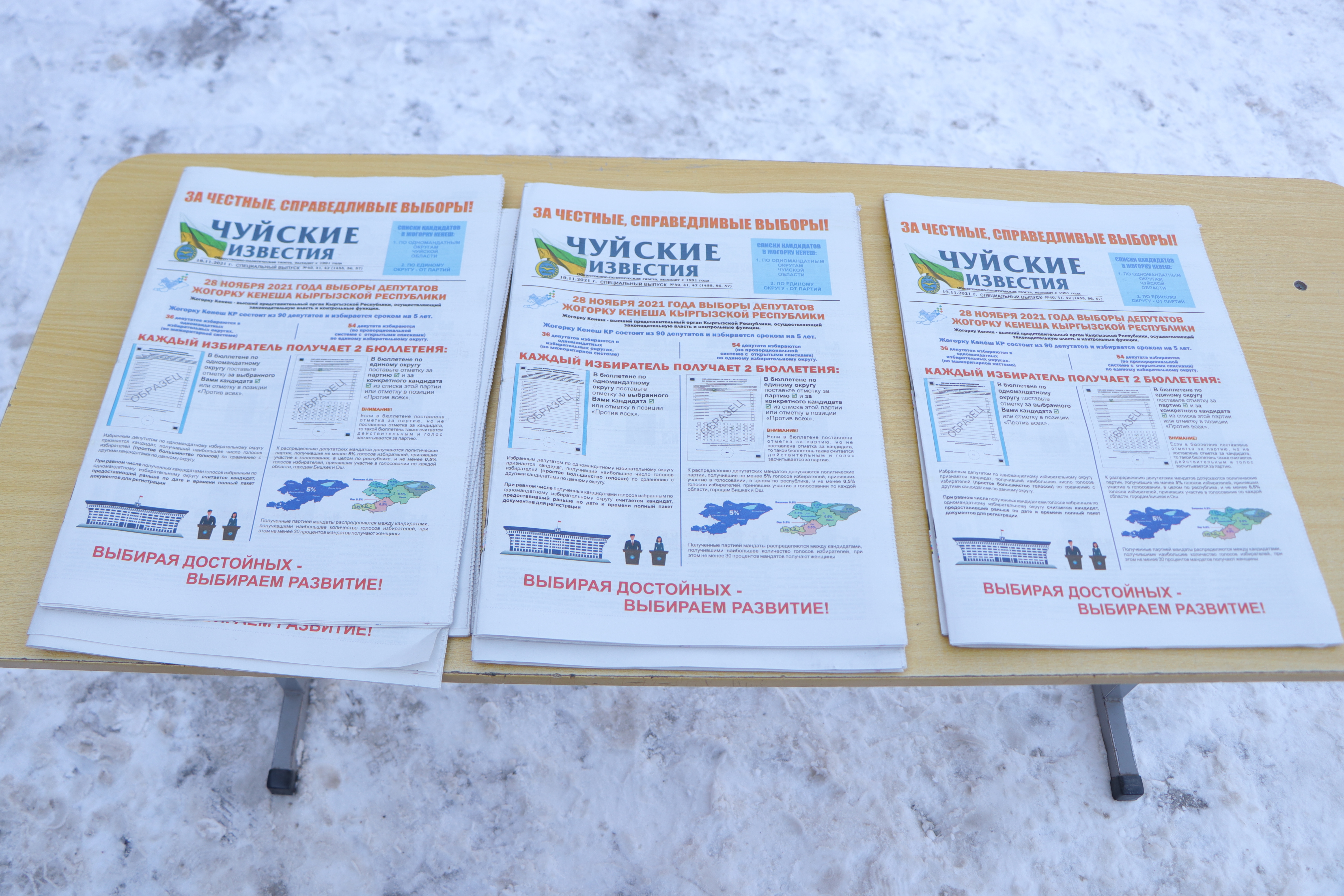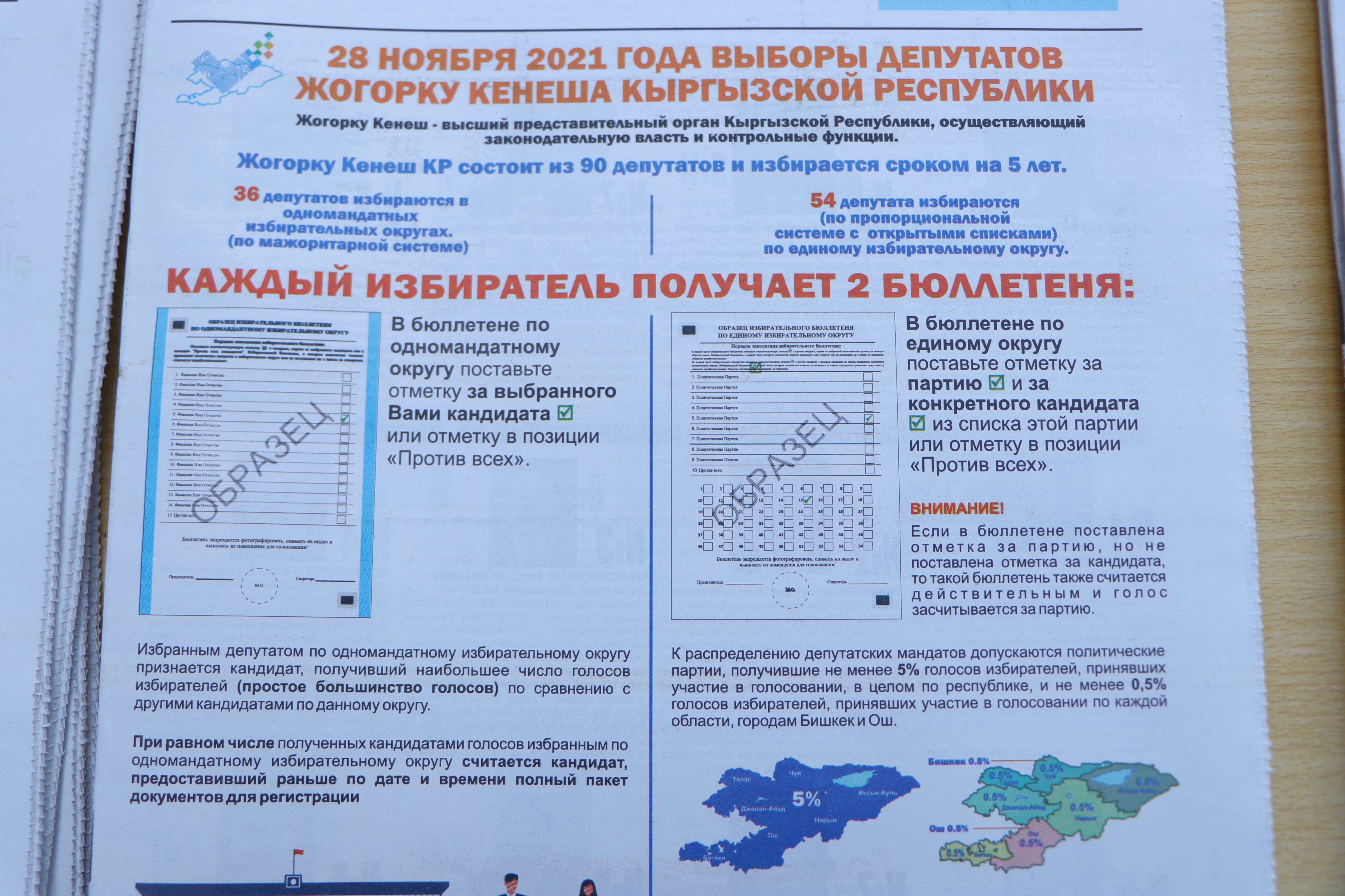 Добуш берүүгө катышкан шайлоочуларга 2ден шайлоо бюллетени берилди. Бир мандаттуу округ боюнча шайлоодо шайлоочу шайлоо бюллетенинде: