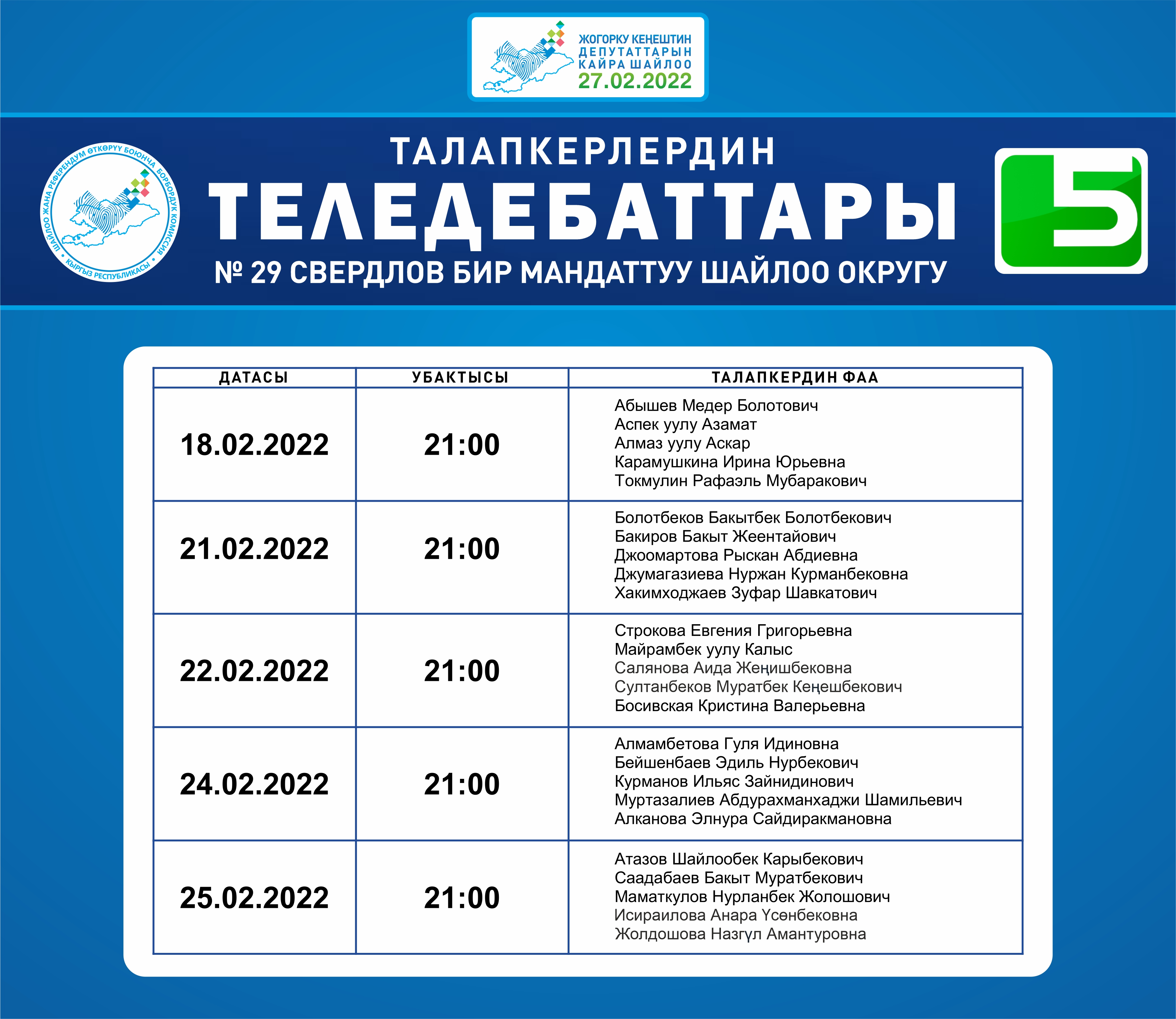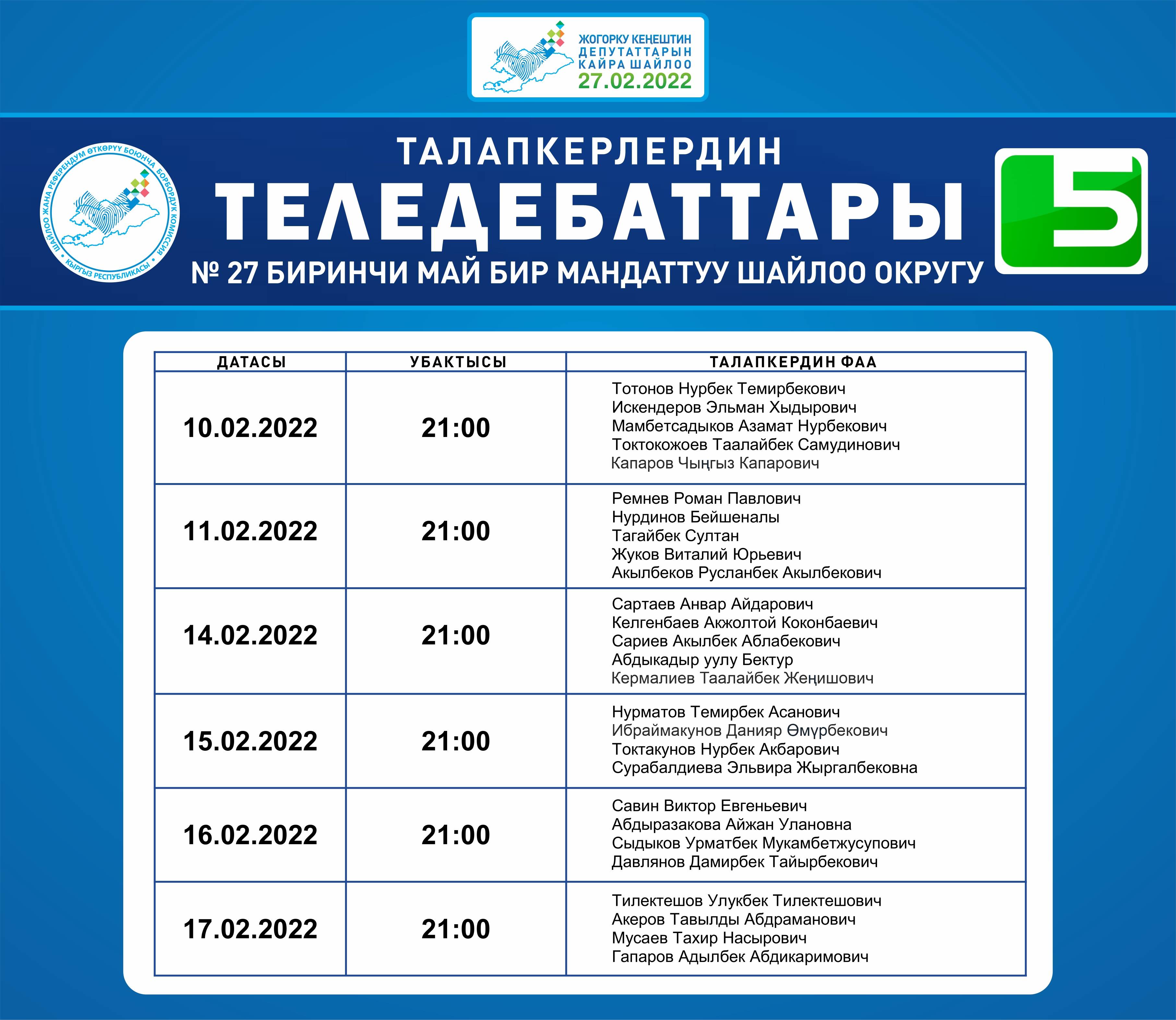 № 27 Биринчи май жана № 29 Свердлов бир мандаттуу шайлоо округдары боюнча теледебаттардын графиги
