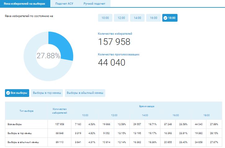 Кыргыз Республикасынын Шайлоо жана референдум өткөрүү боюнча борбордук комиссиясы Жалал-Абад, Ысык-Көл, Нарын, Ош жана Чүй облустарынын 13 айылдык кеңешинин депутаттарын шайлоодо саат 18.00гө шайлоочулардын добуш берүүсүнүн жүрүшү тууралуу маалымат берет: