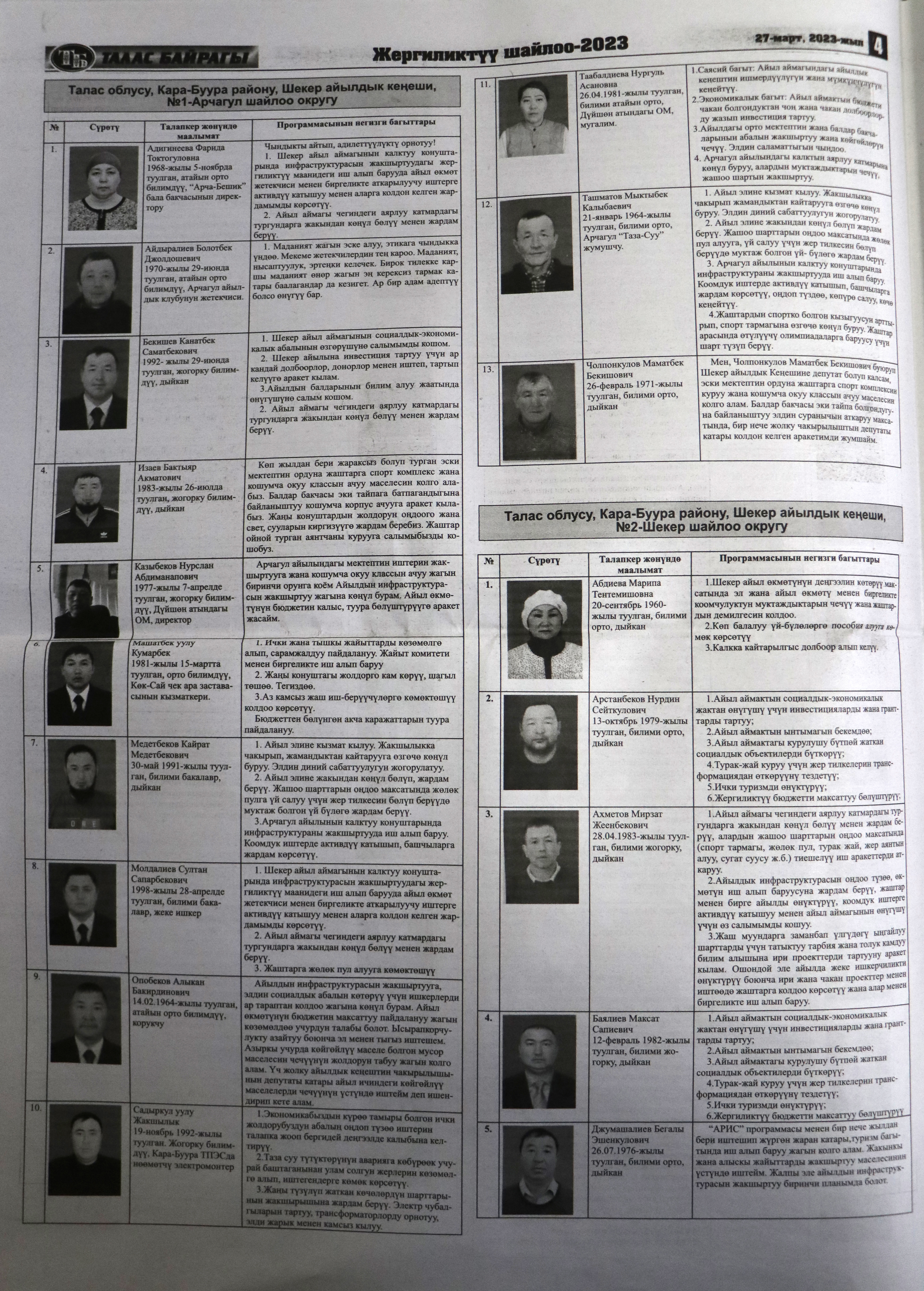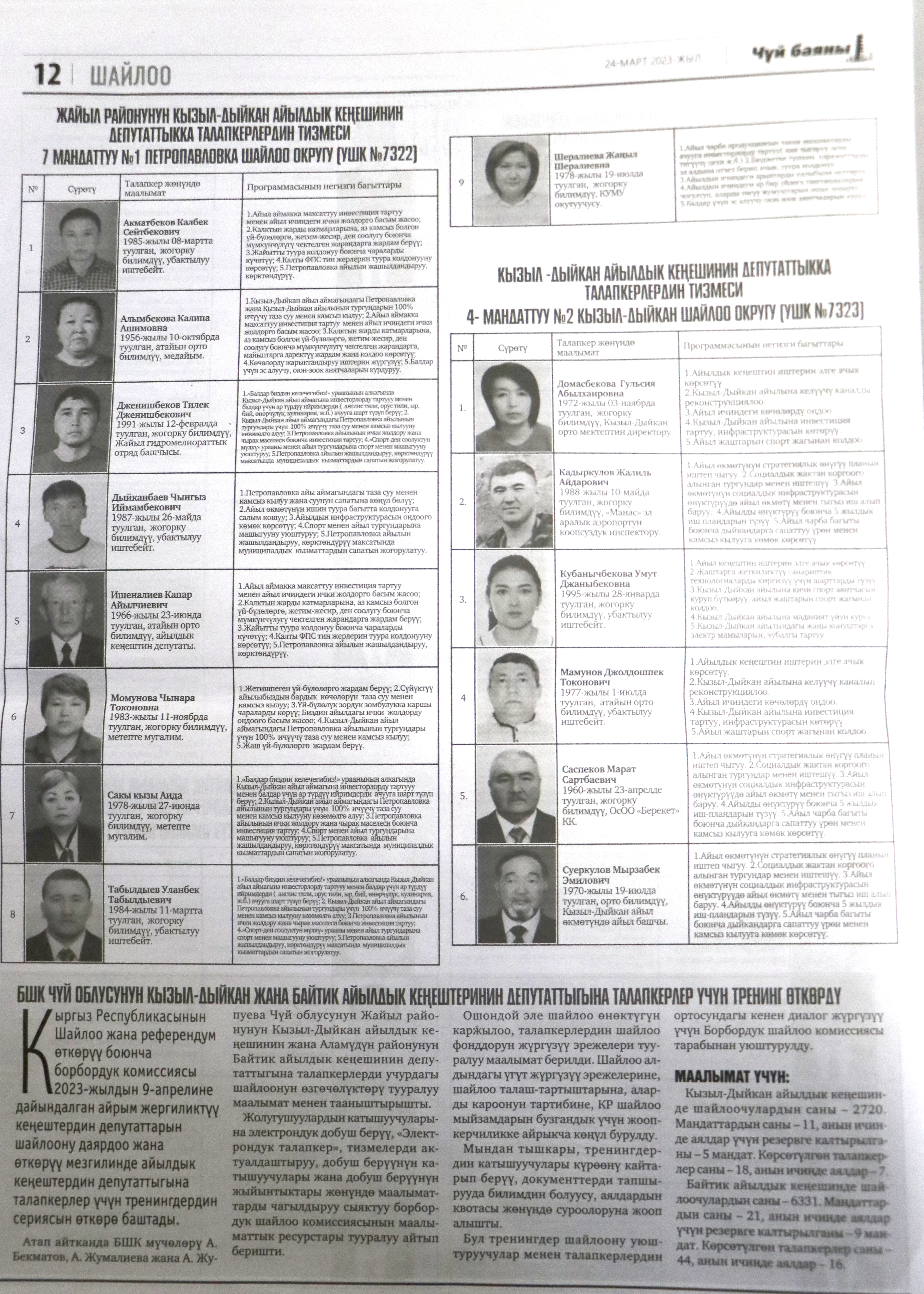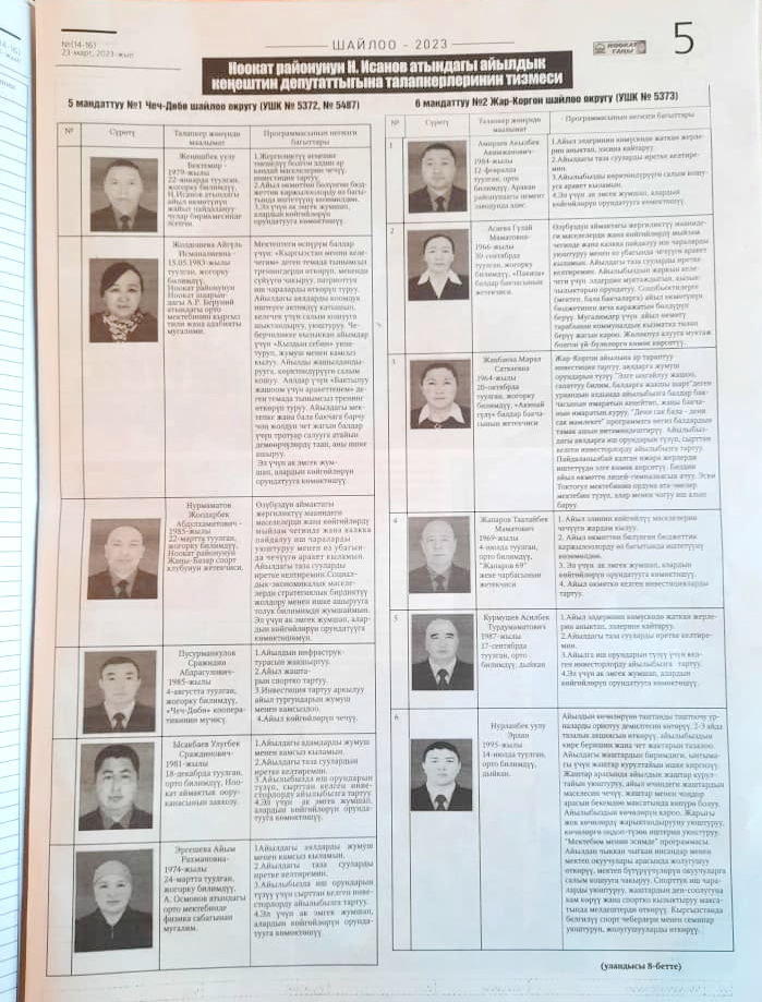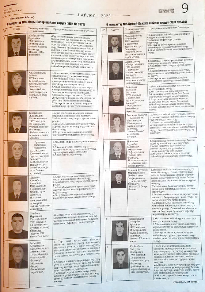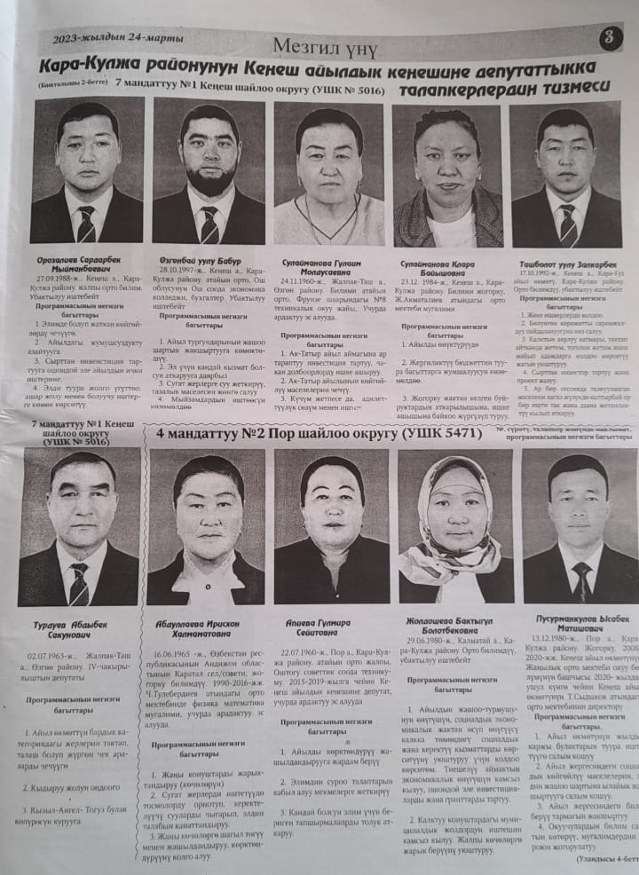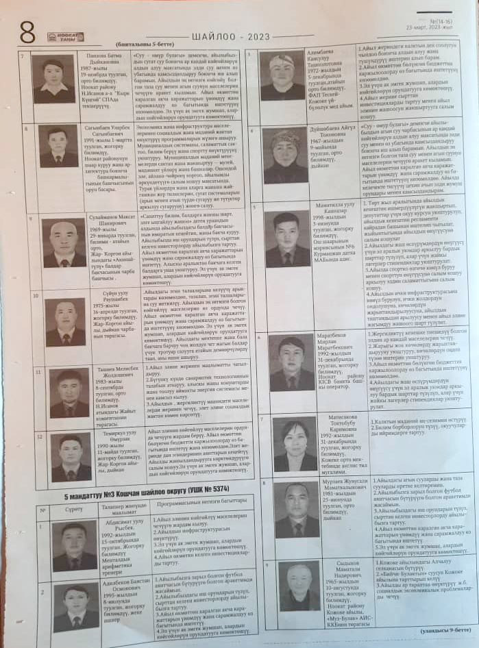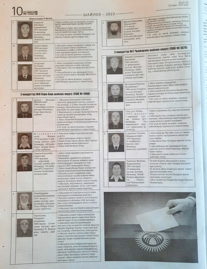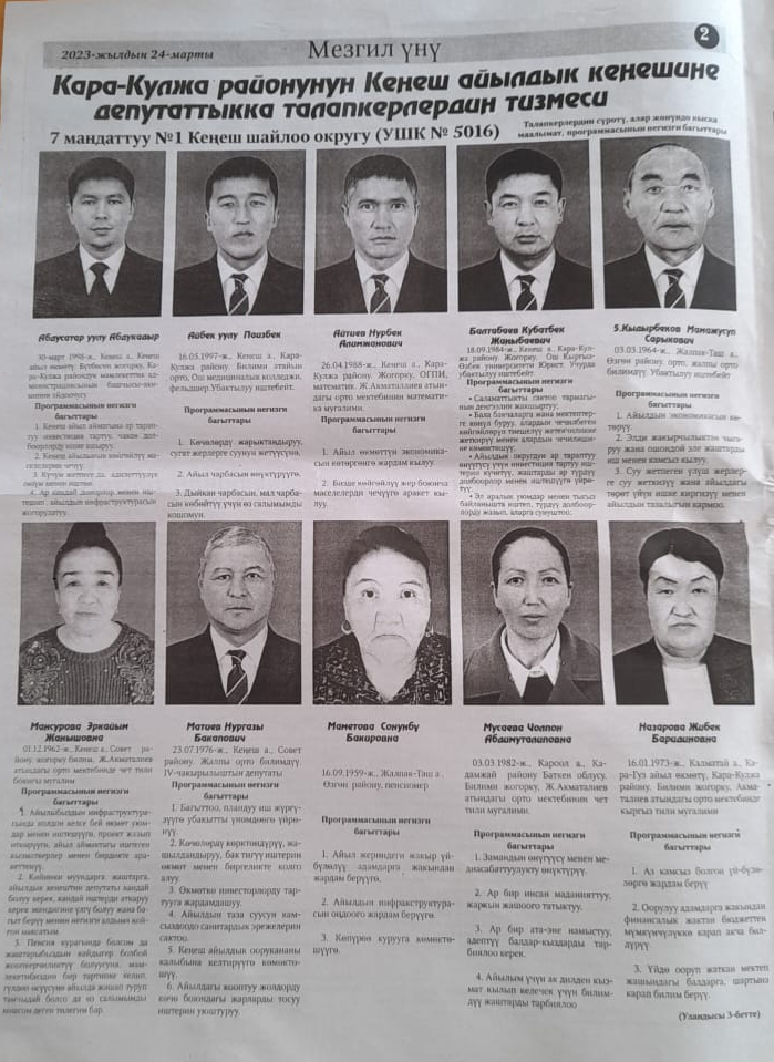 Жергиликтүү кеңештерлдин депутаттыгына талапкерлер жѳнүндѳ шайлоочуларды маалымдоо максатында БШК райондук жана облустук гезиттерде маалыматтарды жарыялаган.