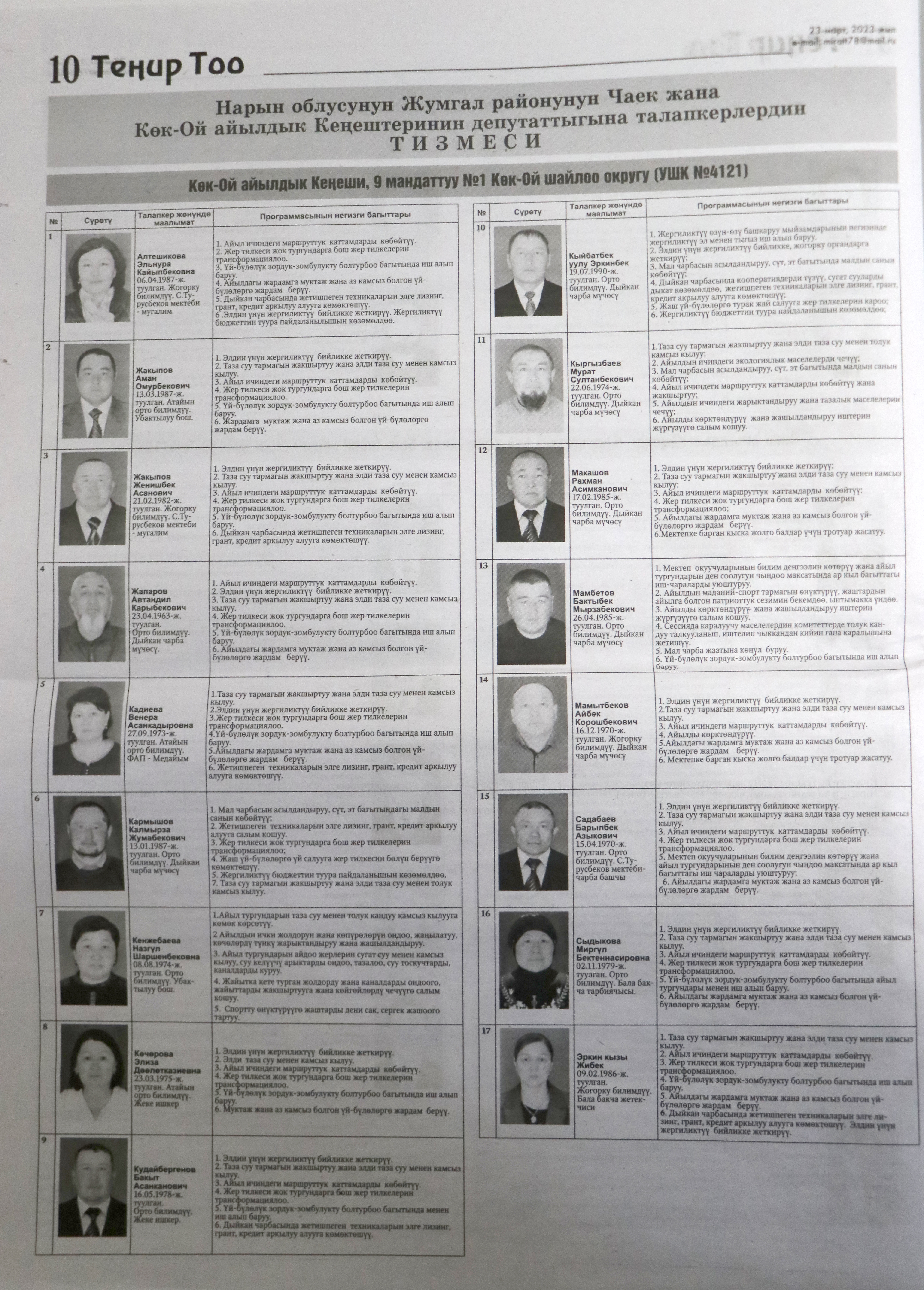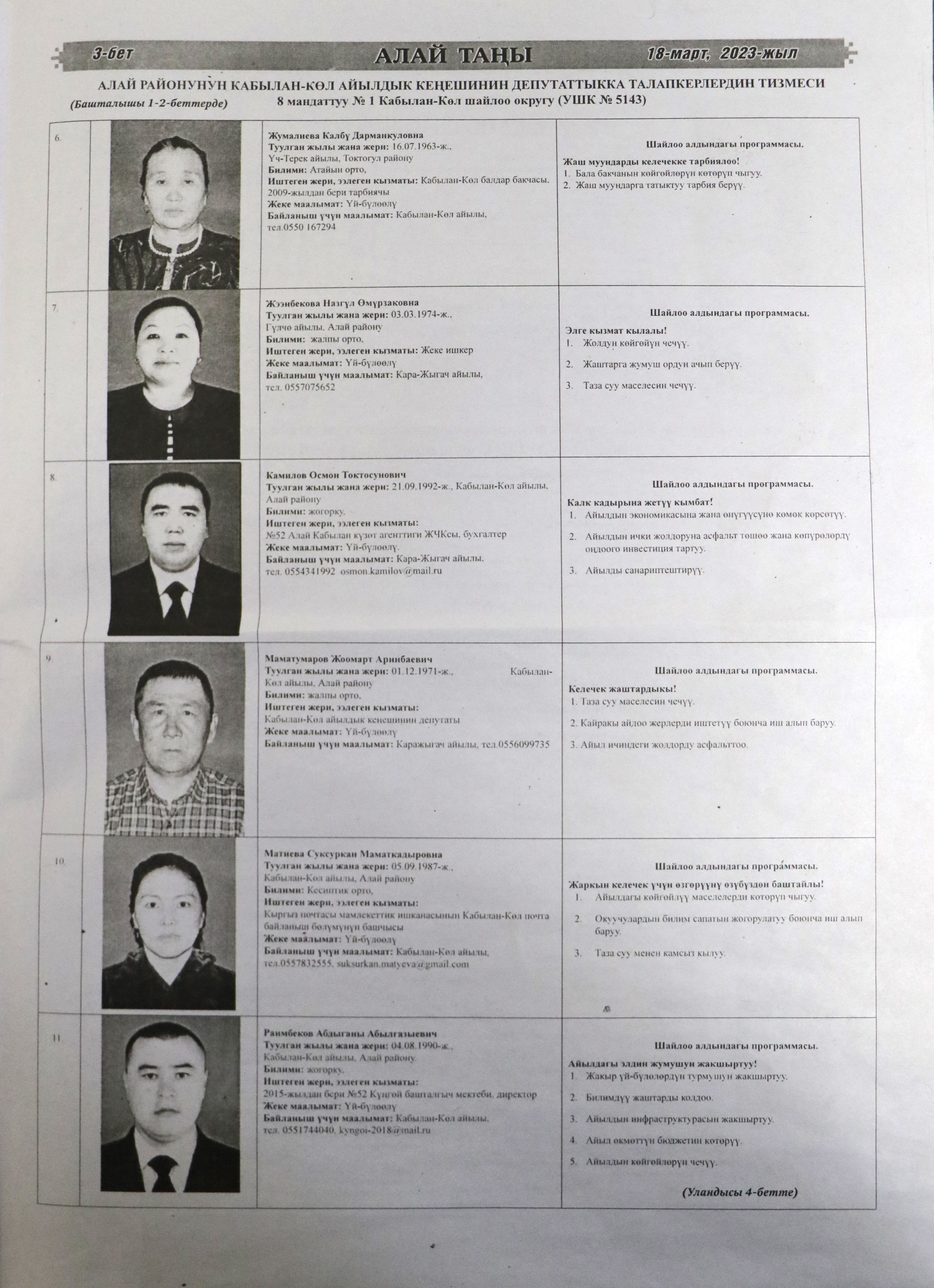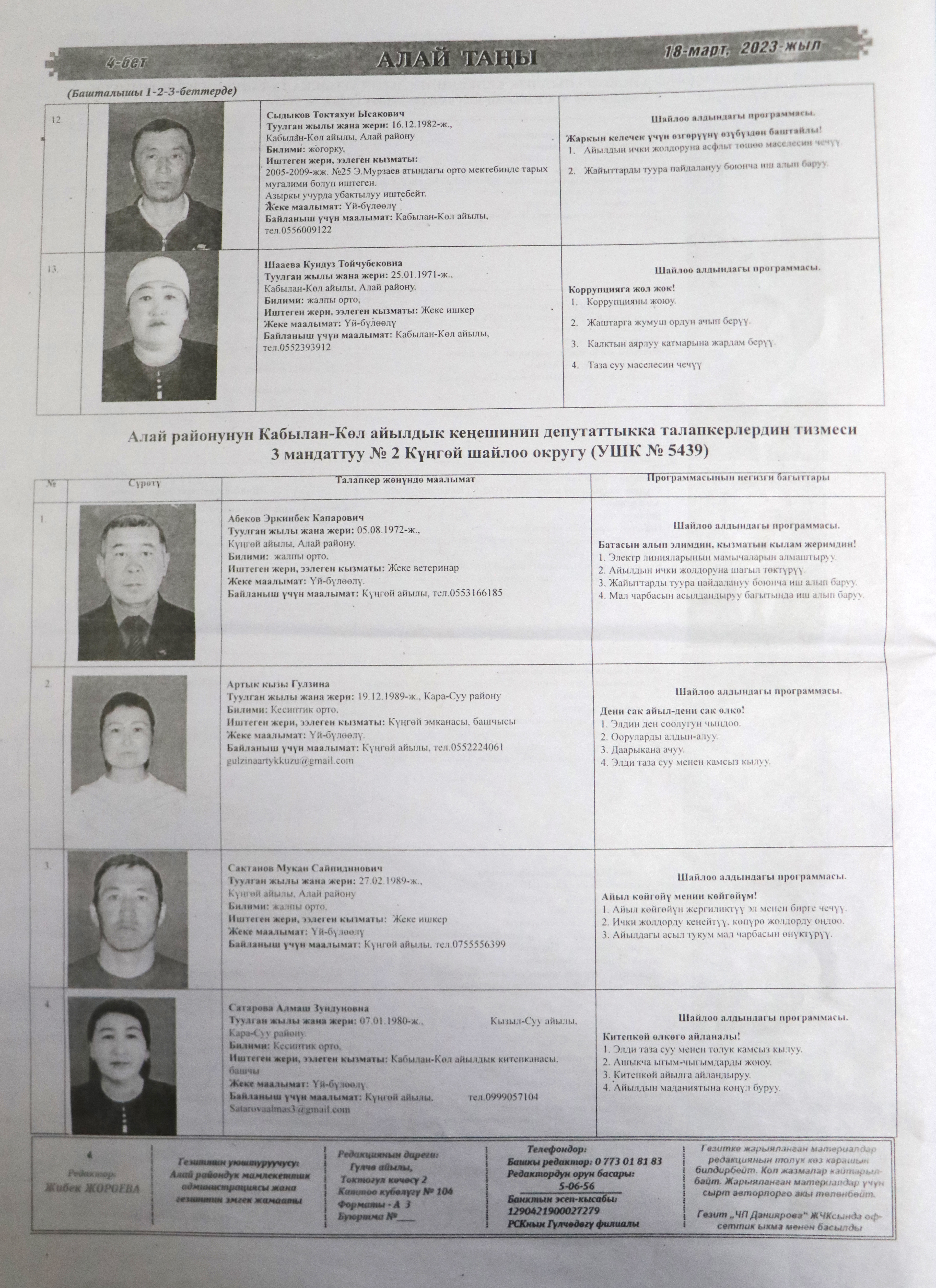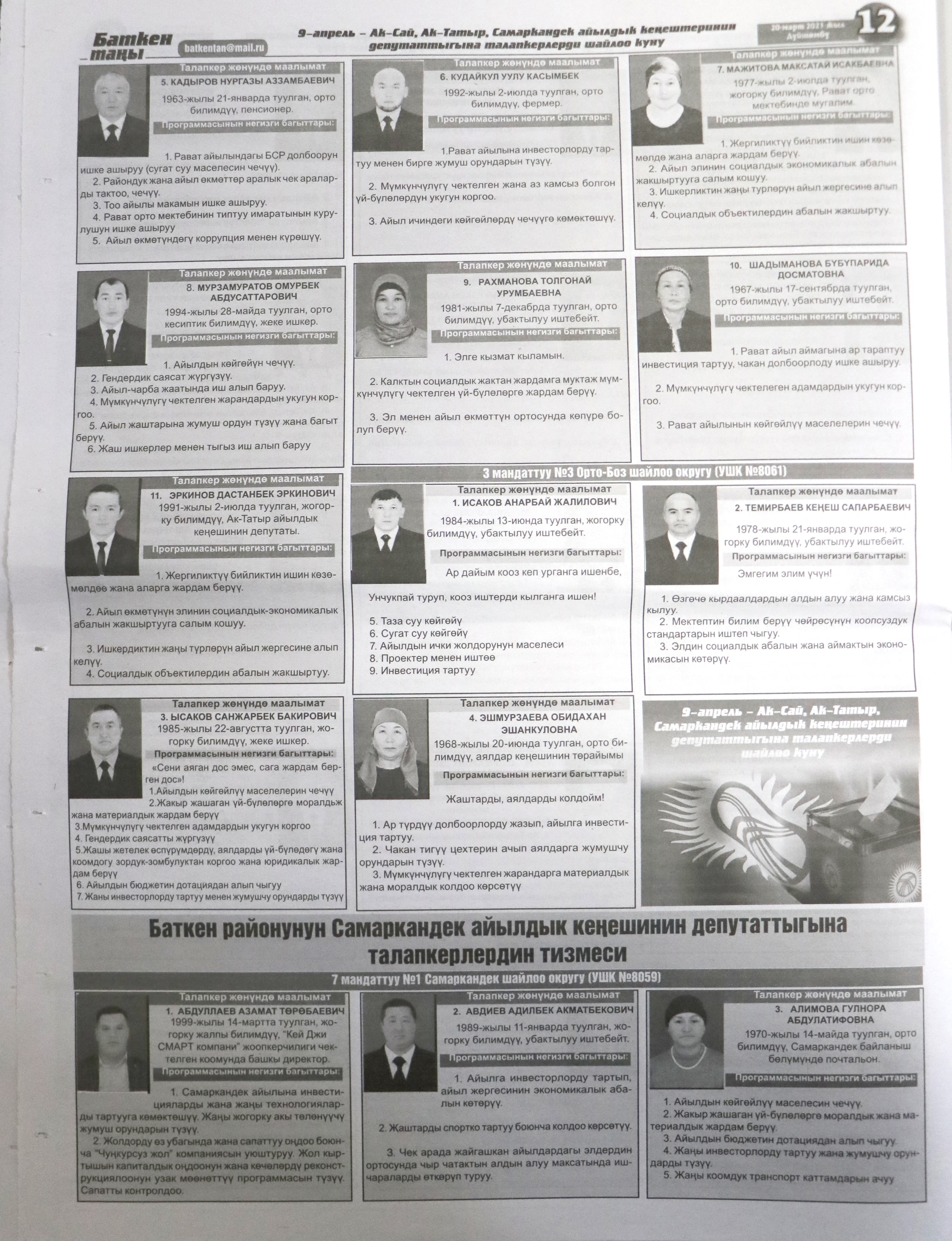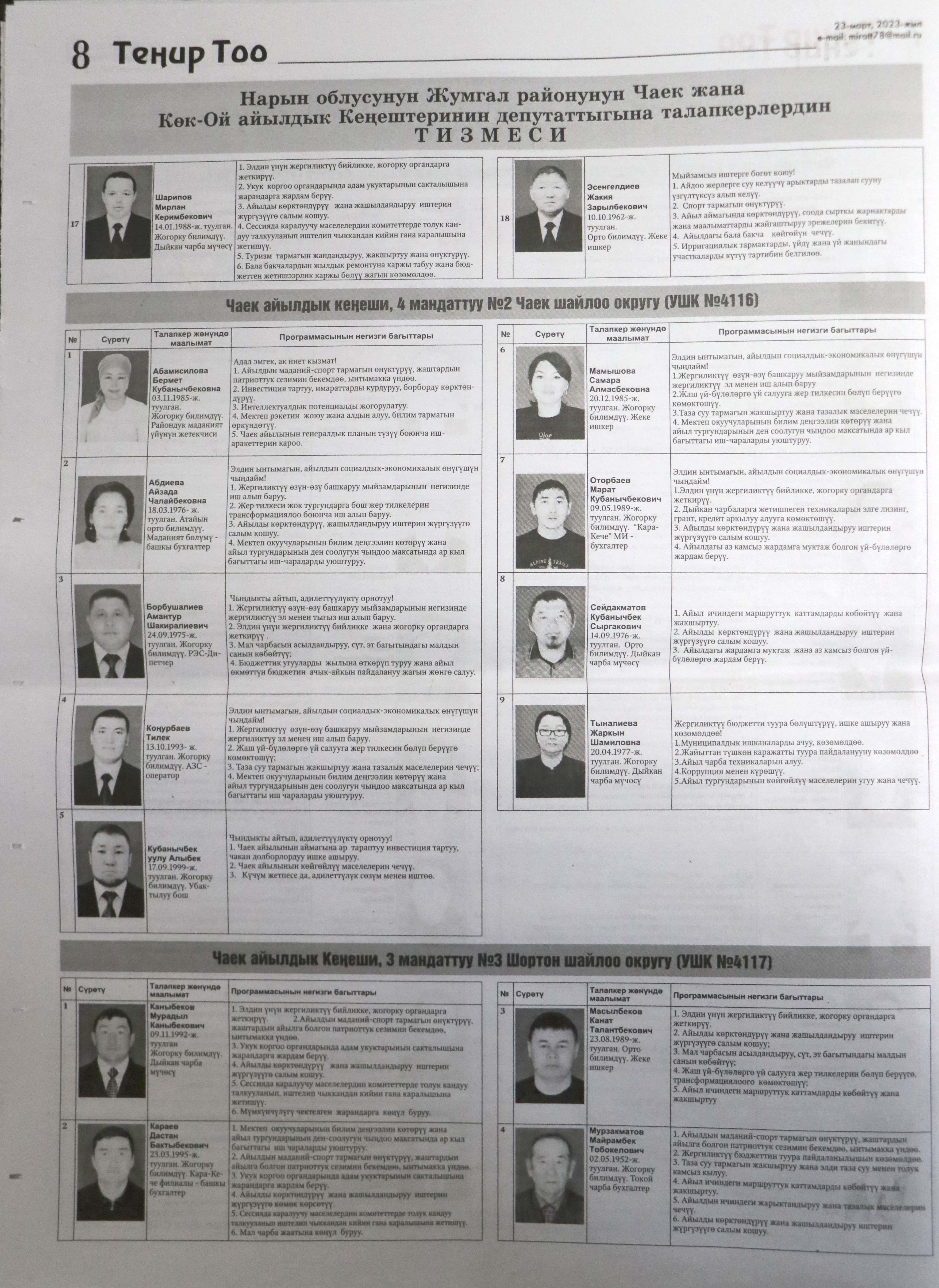 Жергиликтүү кеңештерлдин депутаттыгына талапкерлер жѳнүндѳ шайлоочуларды маалымдоо максатында БШК райондук жана облустук гезиттерде маалыматтарды жарыялаган.